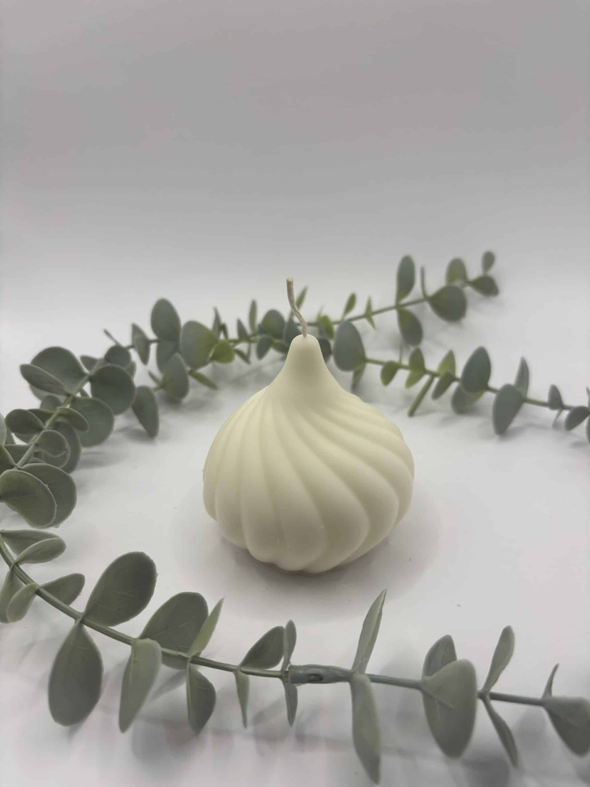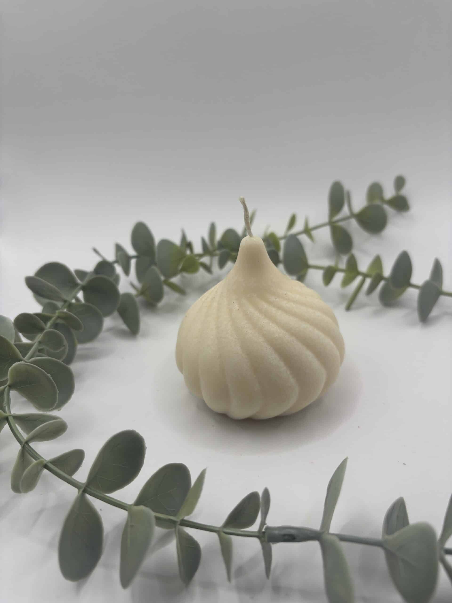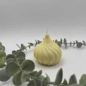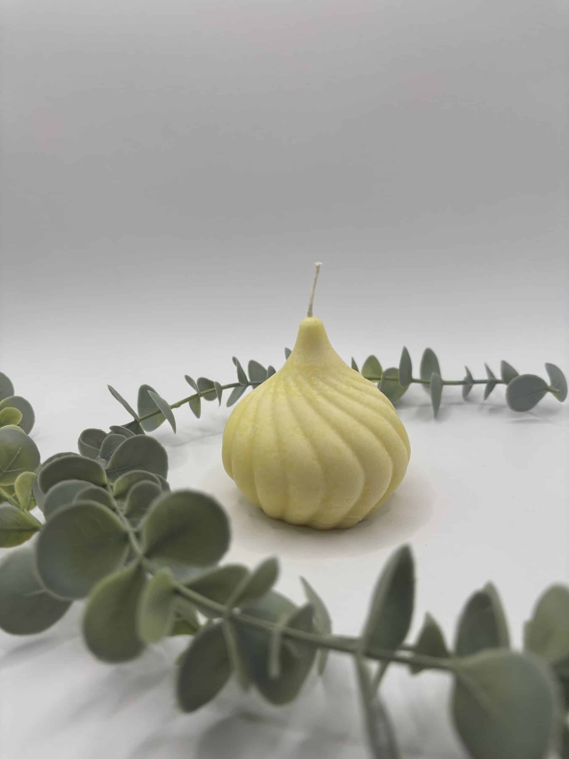 Een beige kaars in de vorm van een ajuin.