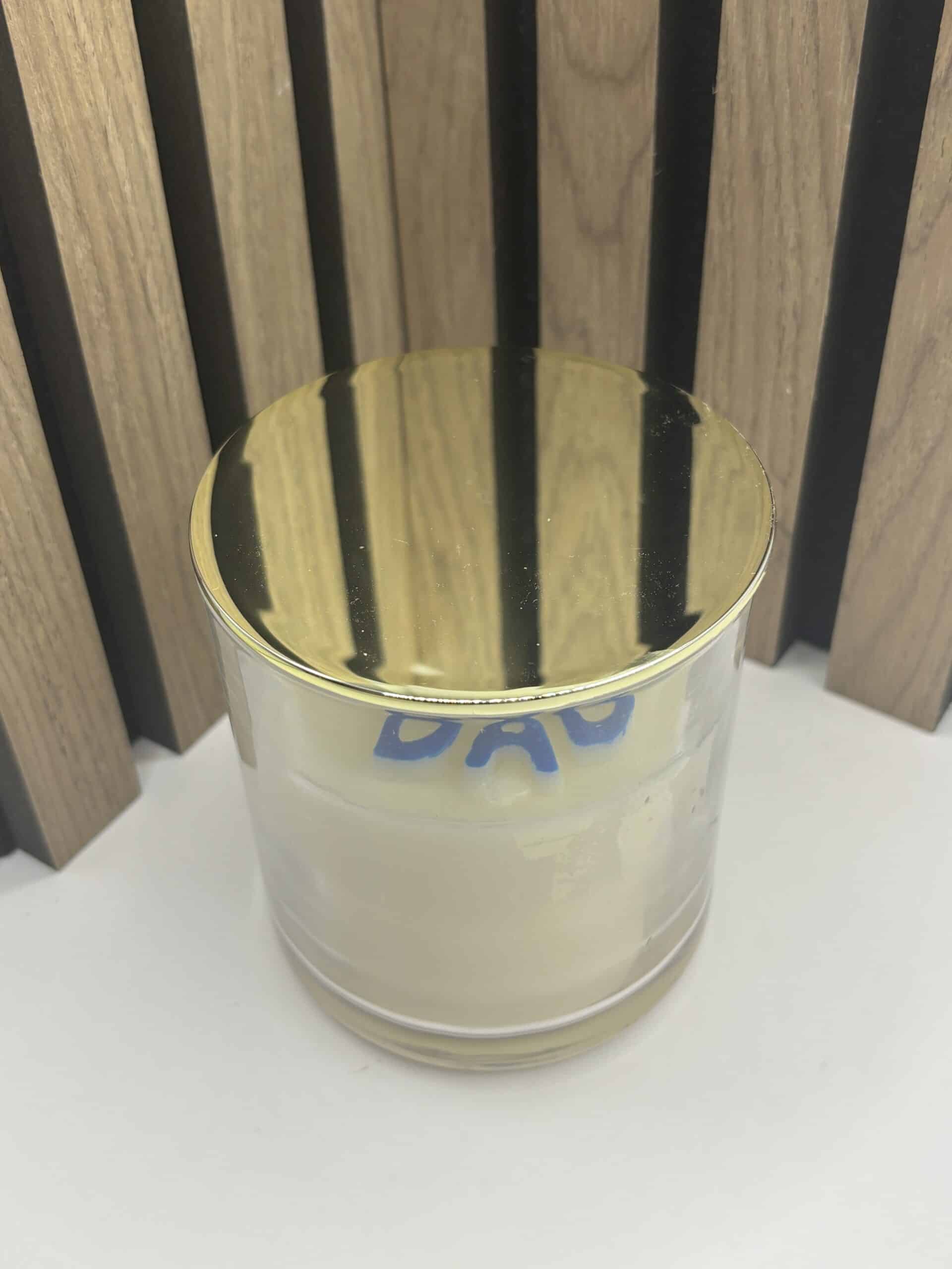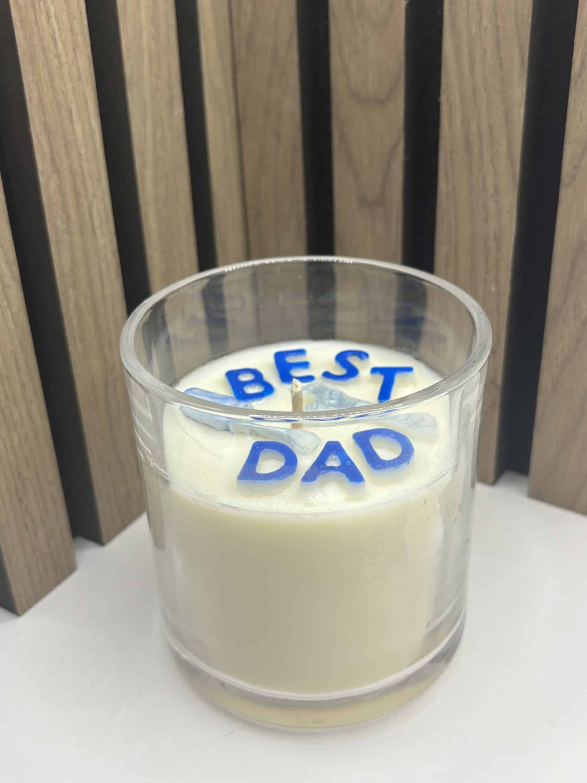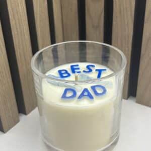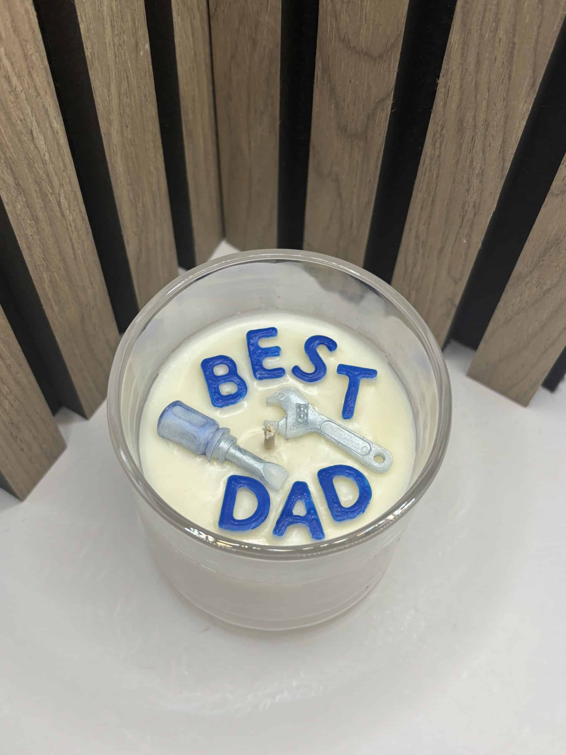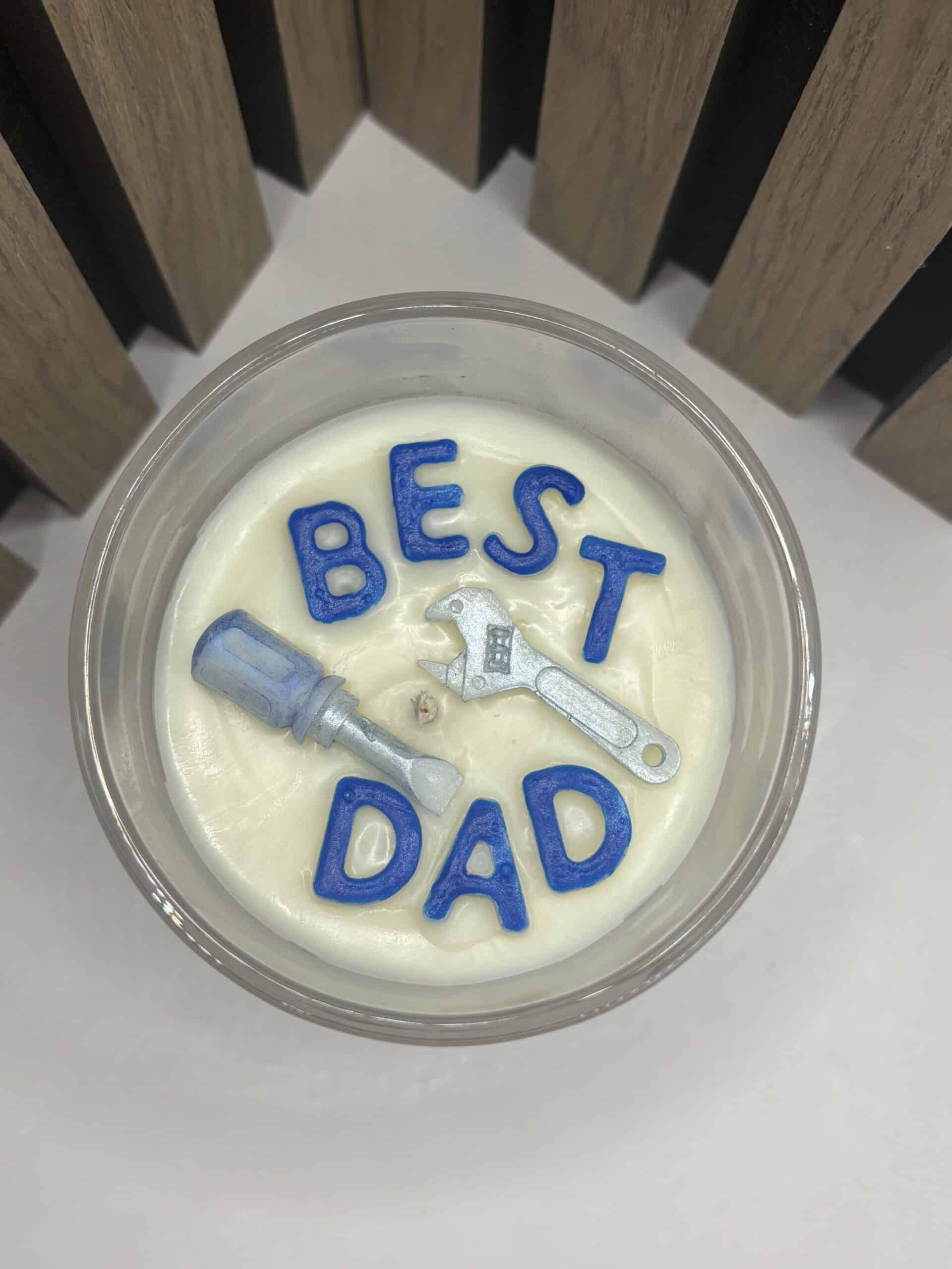 De kaars is vervaardigd uit een laag witte sojawas met daarboven in blauwe letters ‘Best Dad’ met een moersleutel en schroevendraaier. De sojawas bevat ook onze happy vanilla geur.