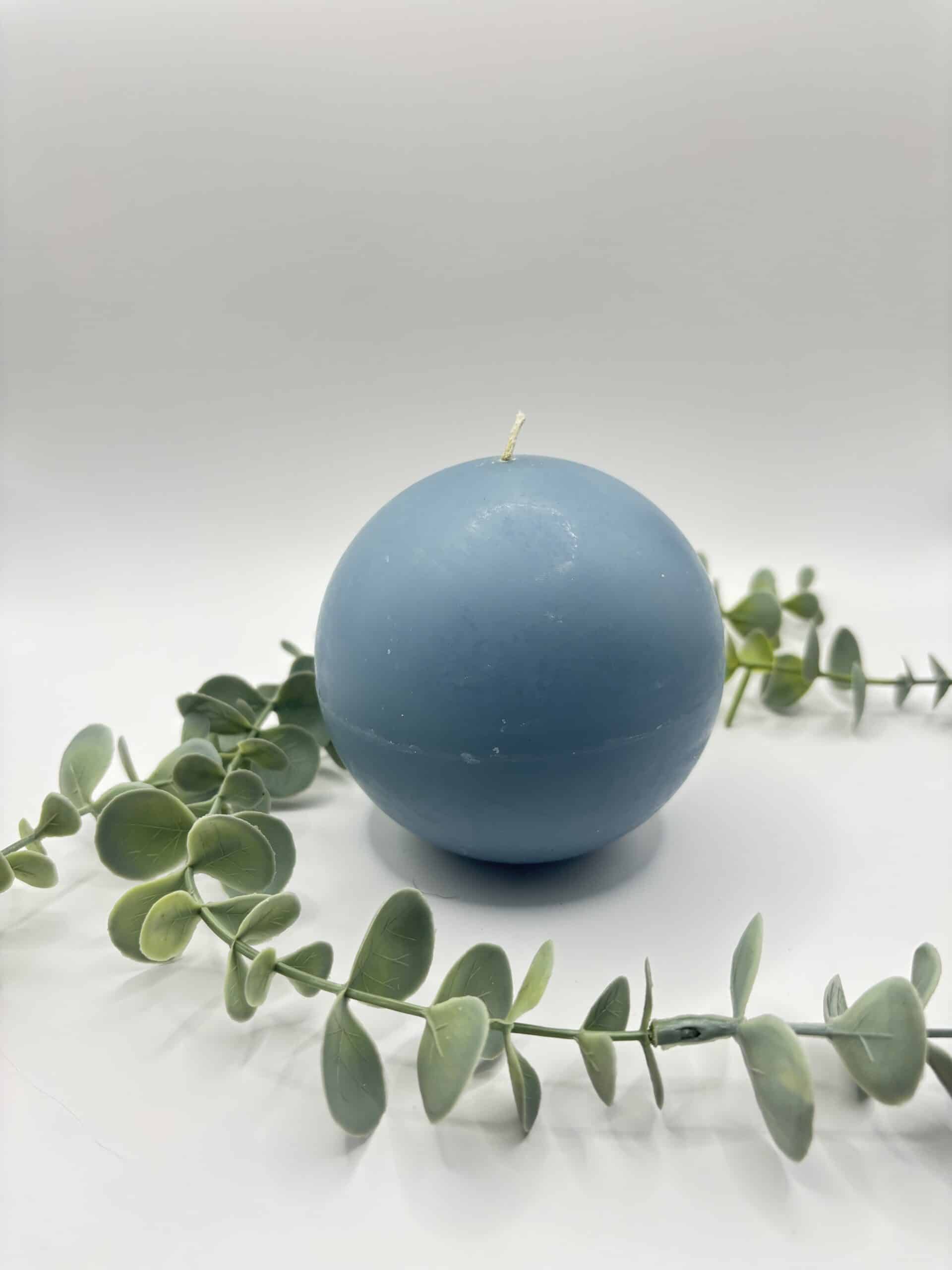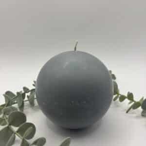 Een grijs-blauwe kaars in de vorm van een grote bol.