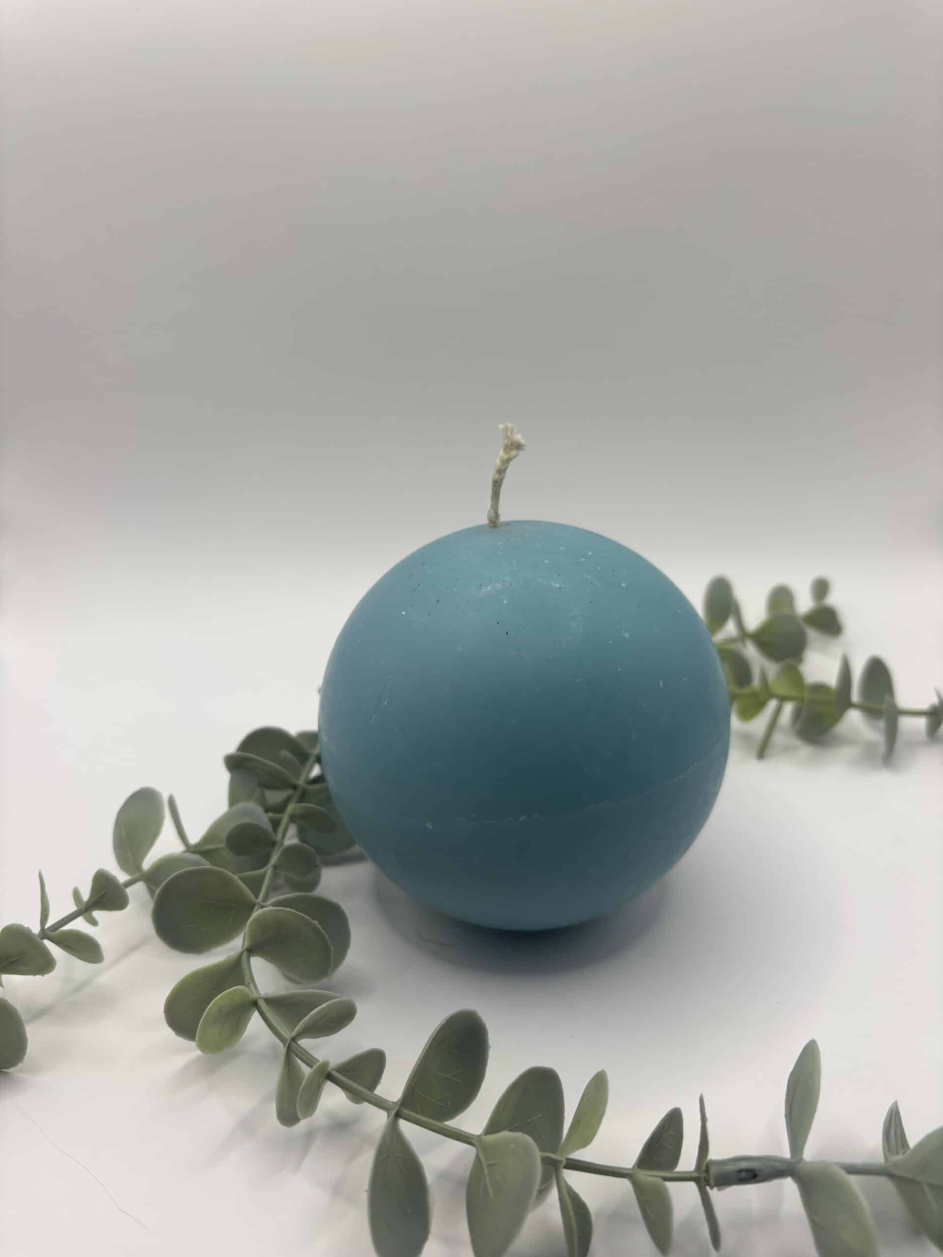 Een blauwe kaars in de vorm van een grote bol.