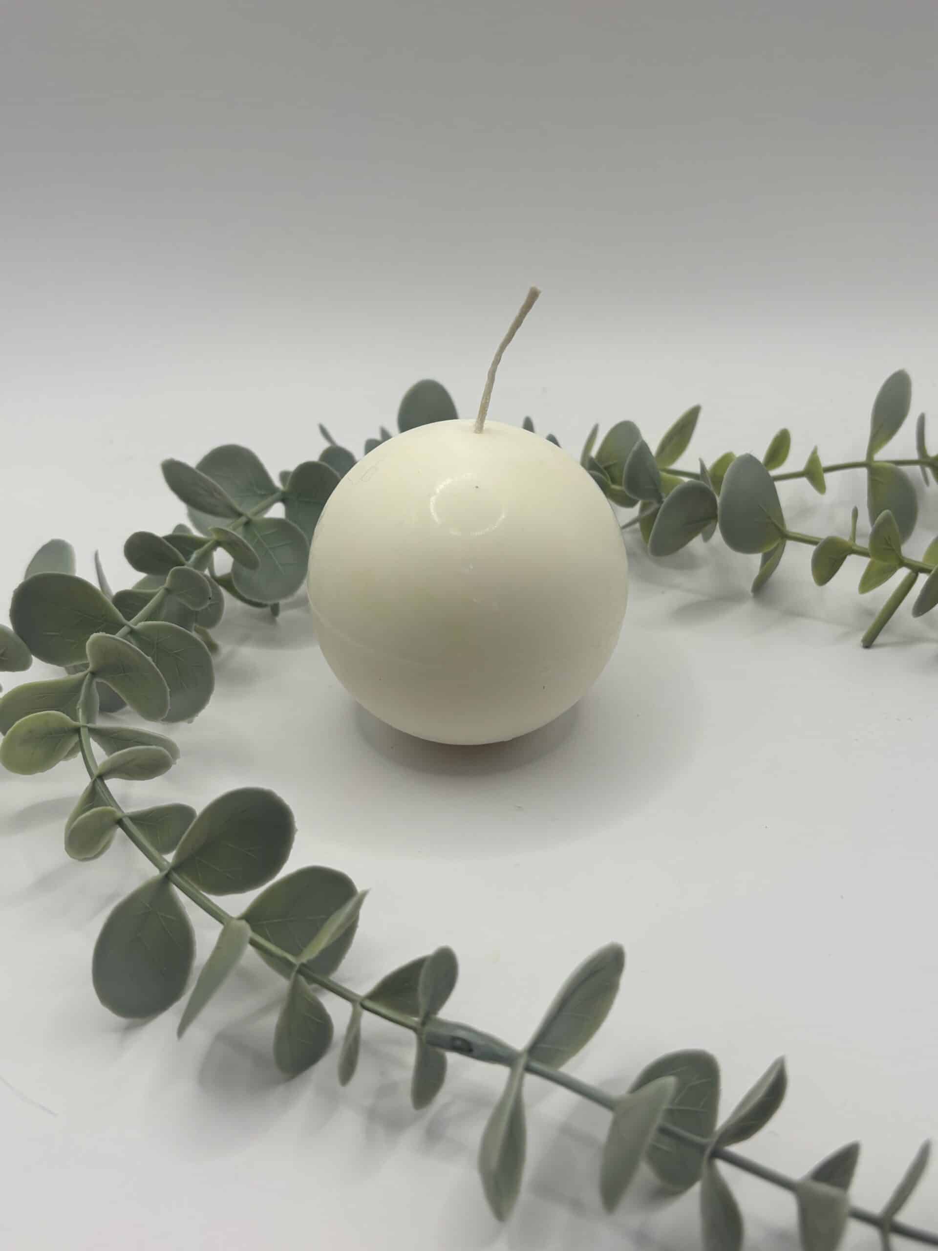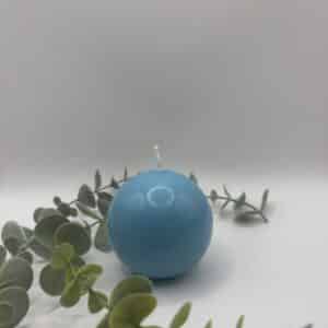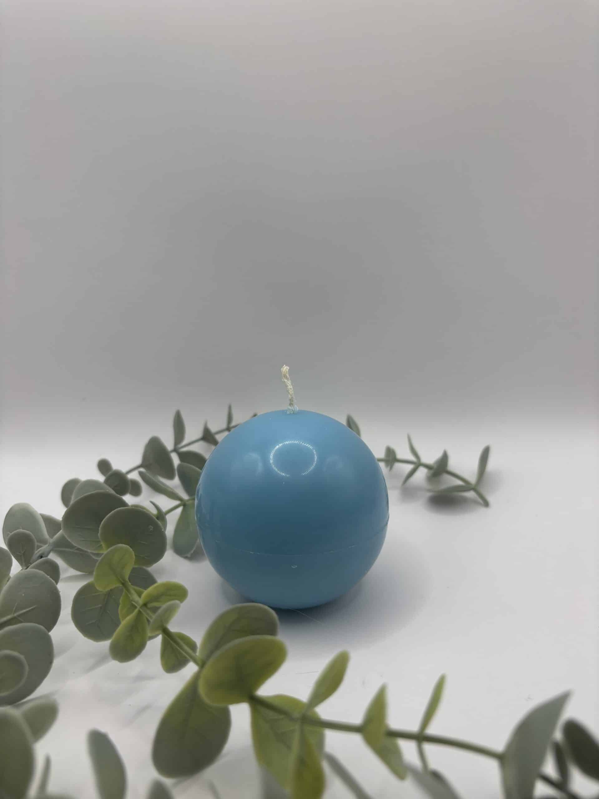 Een baby blauwe kaars in de vorm van een kleine bol.