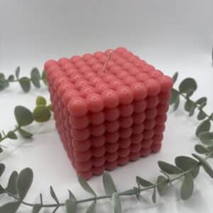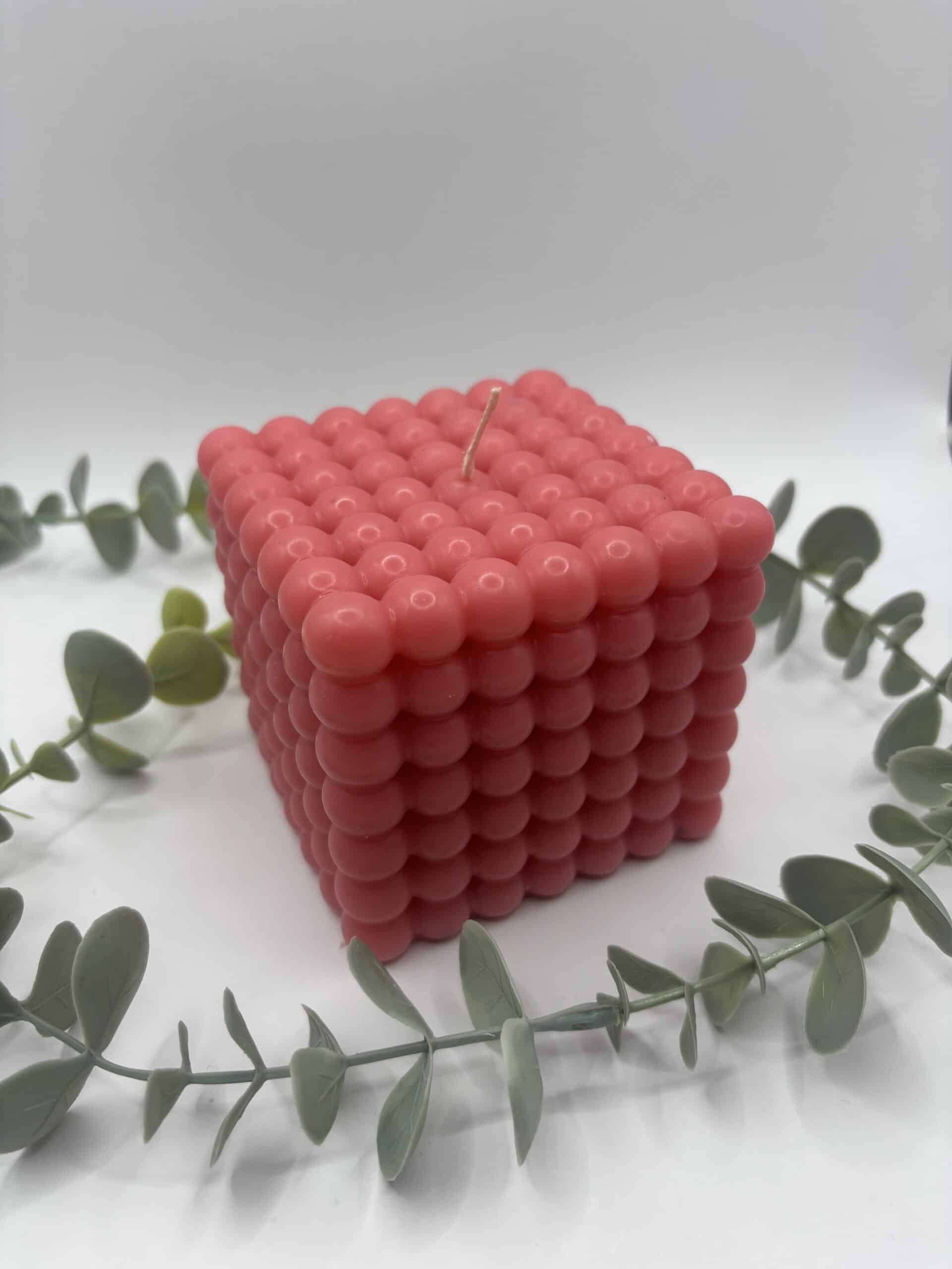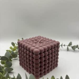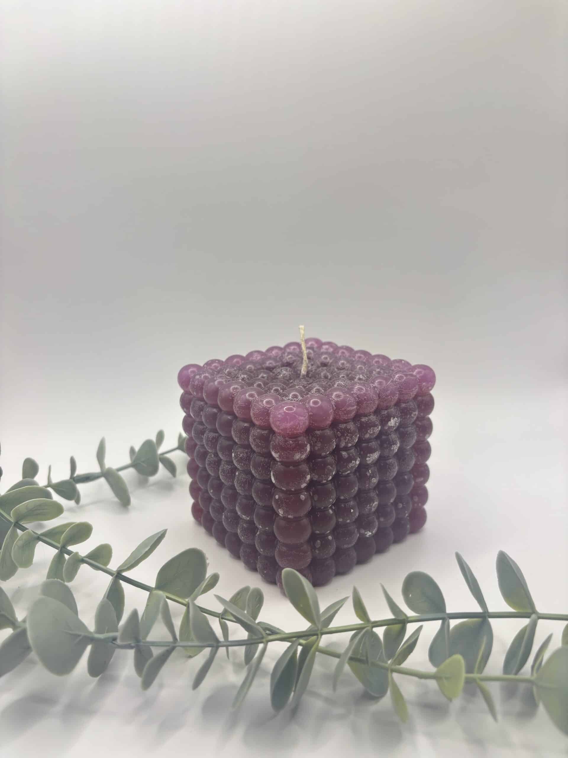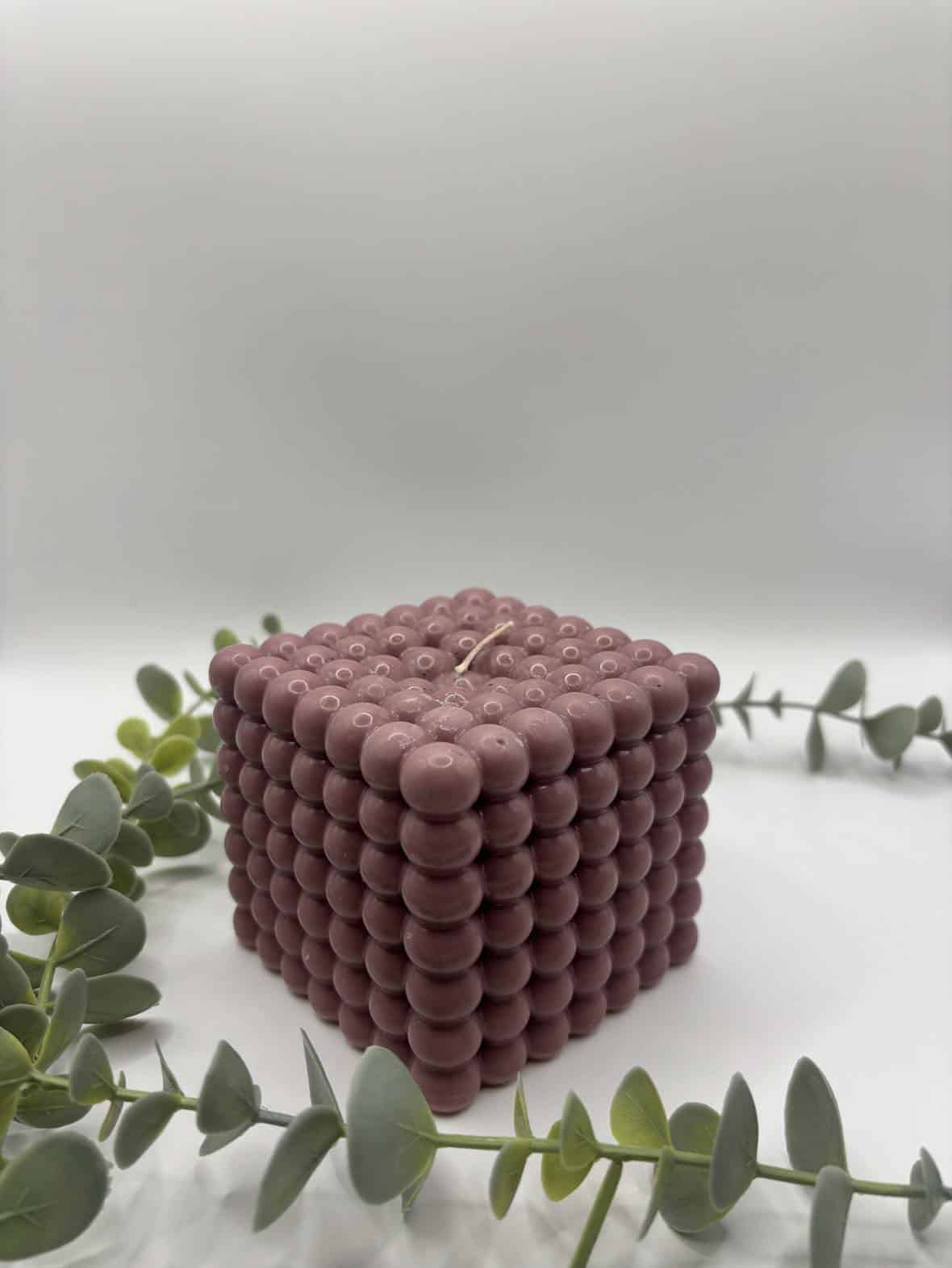Een bordeaux kaars in de vorm van een grote kubus met bolletjes.