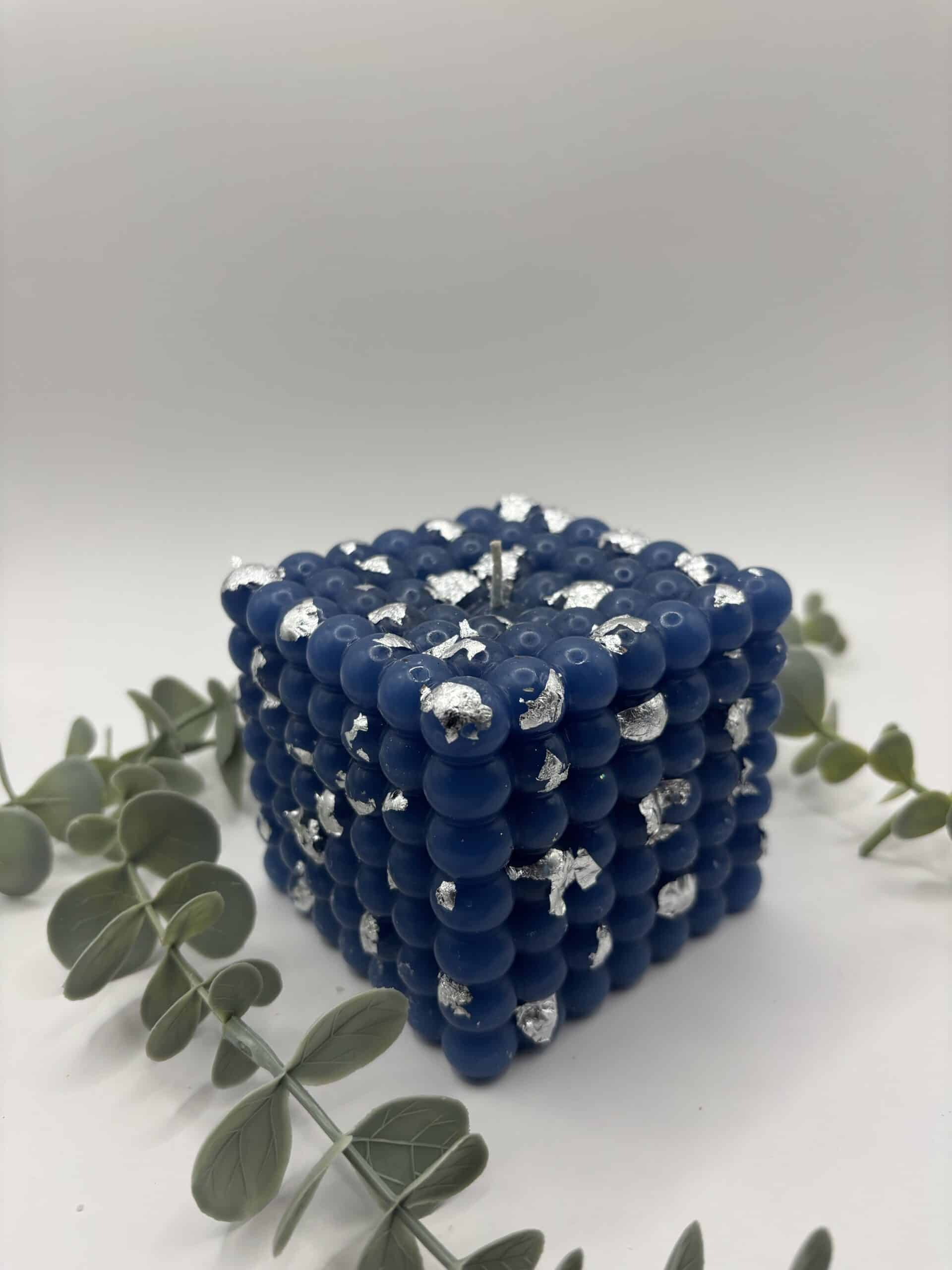• Een witte kaars in de vorm van een kleine kubus met bolletjes.