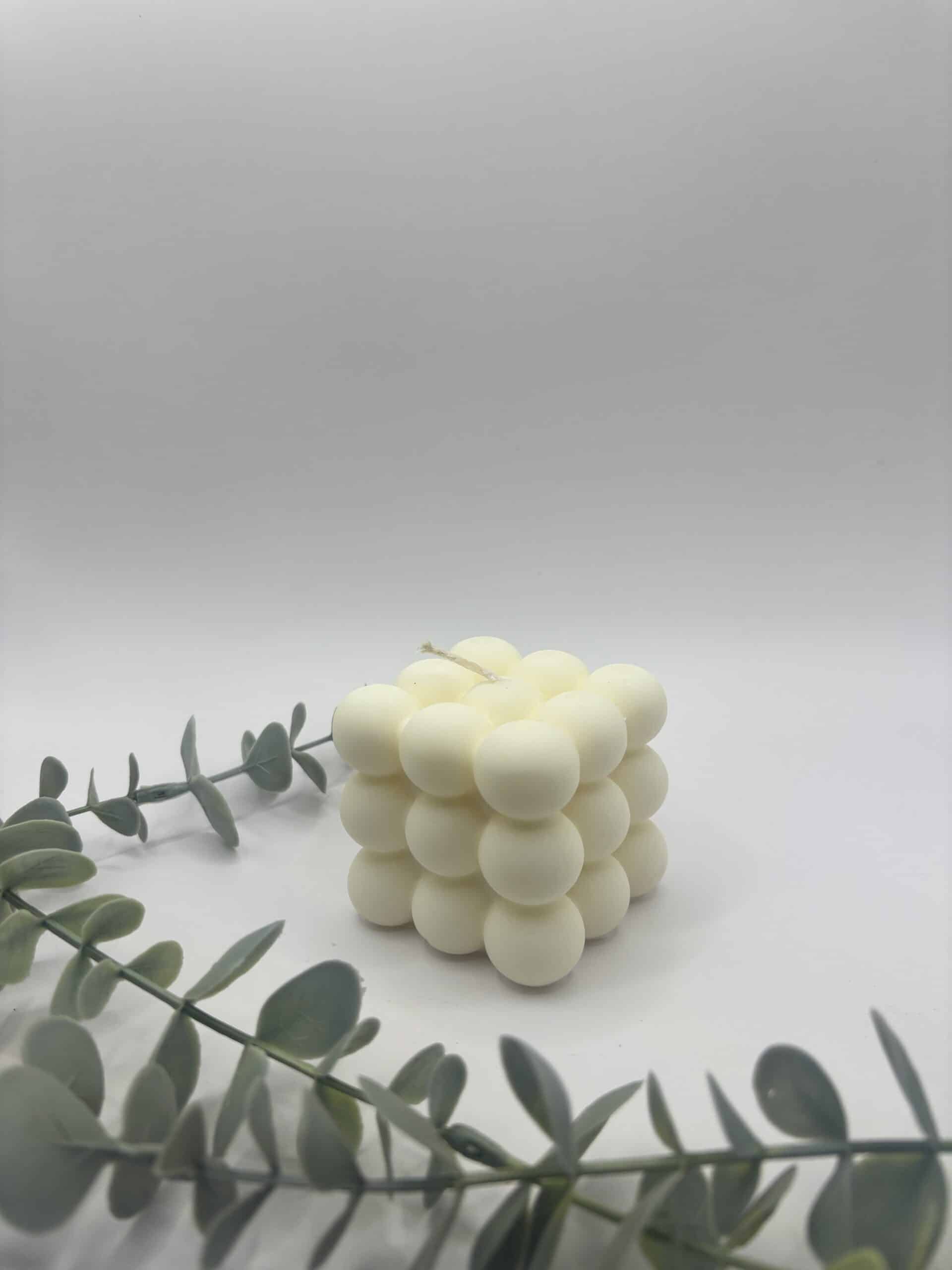 Een witte kaars in de vorm van een medium kubus met bolletjes.