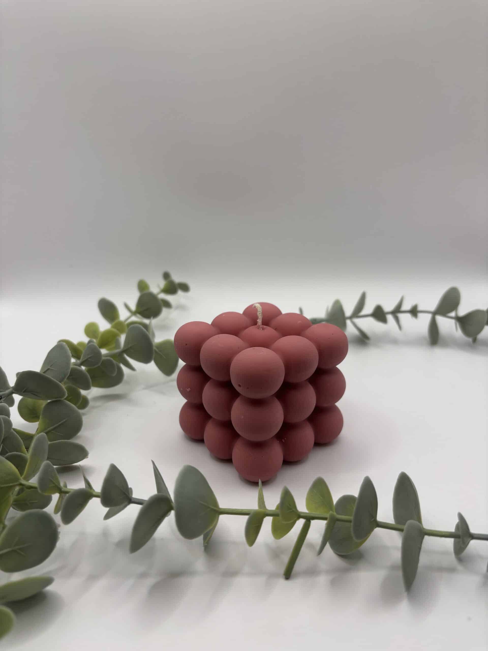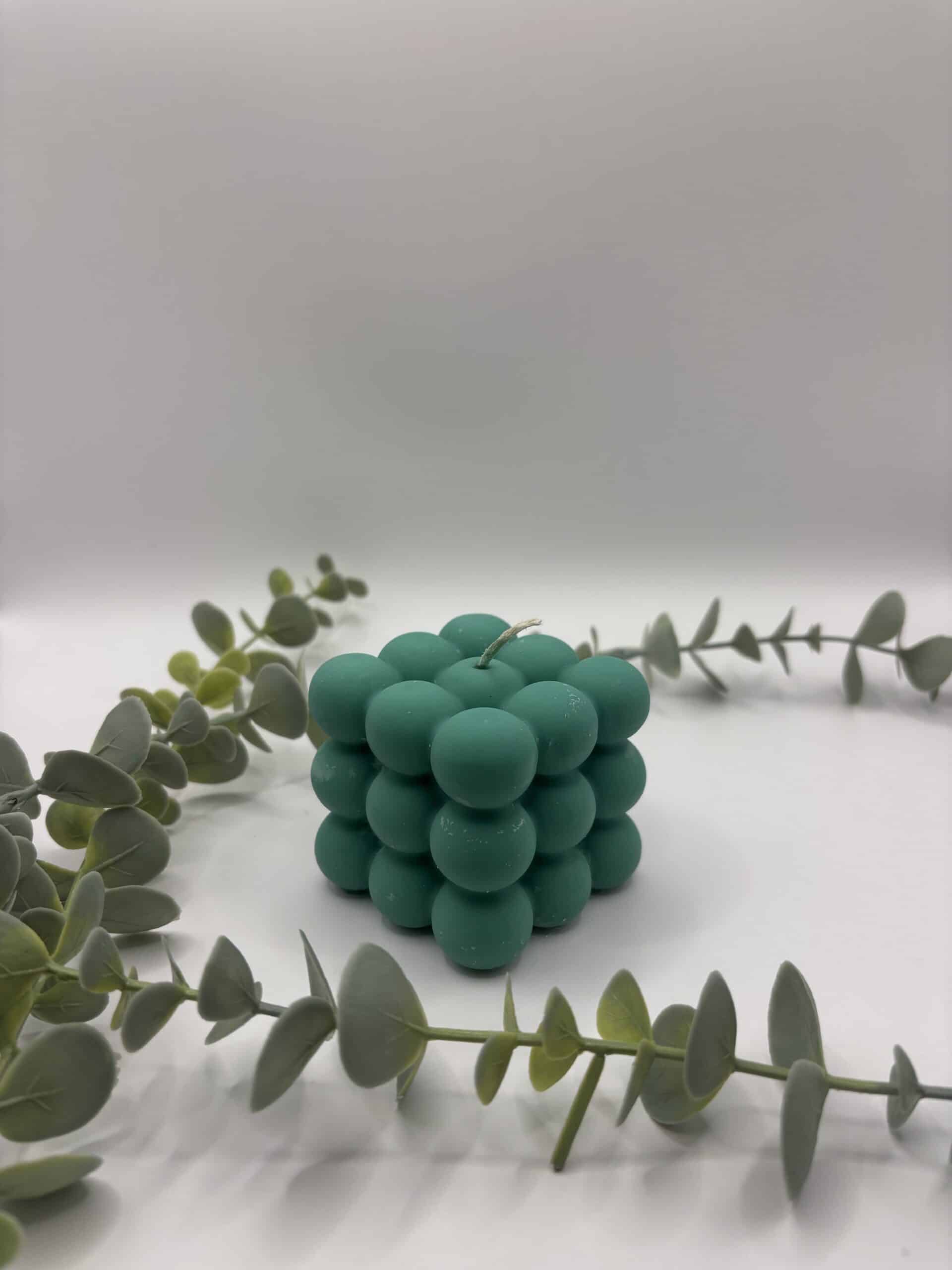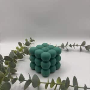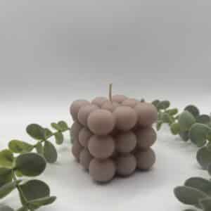 Een grijze kaars in de vorm van een medium kubus met bolletjes.