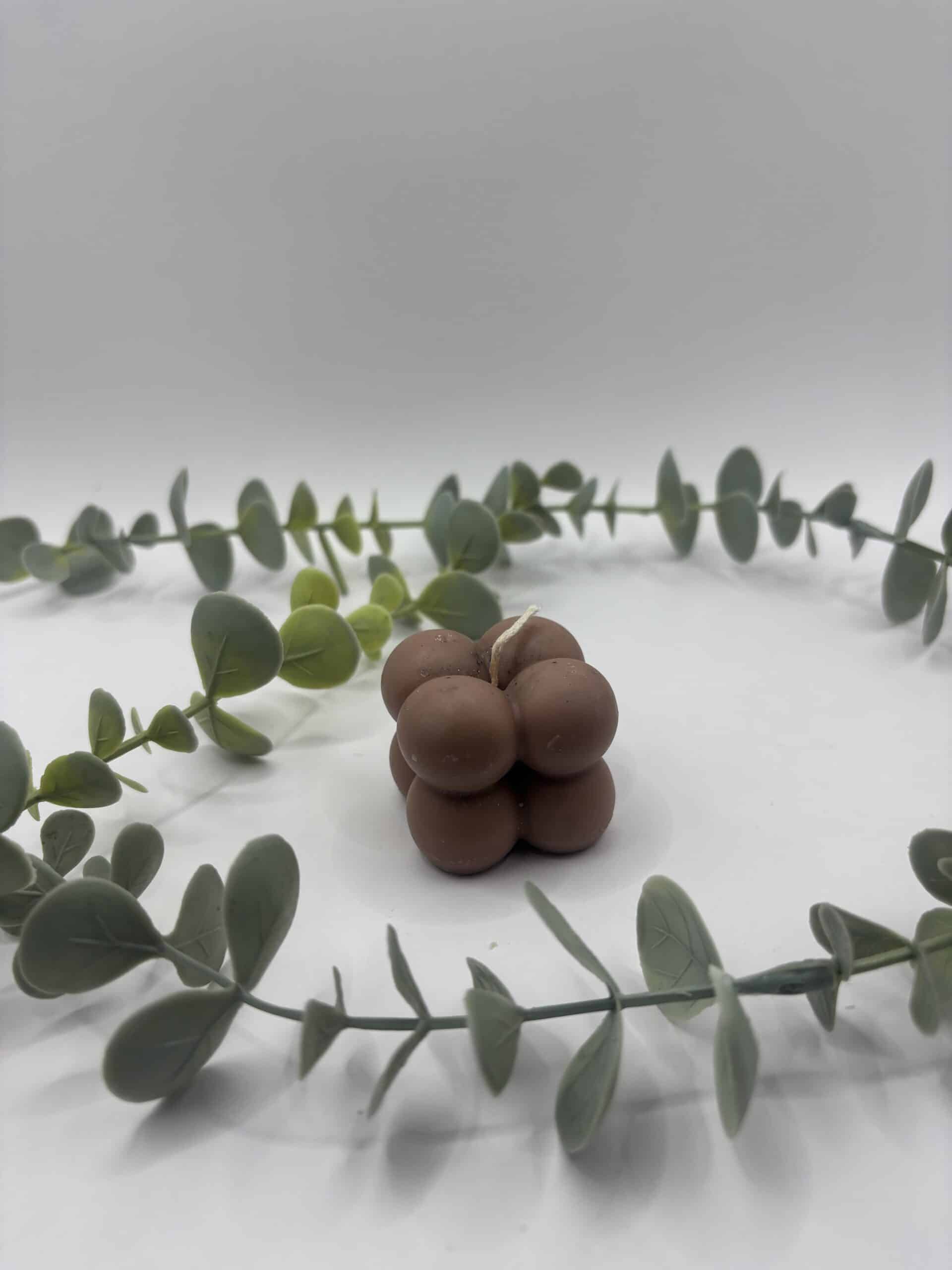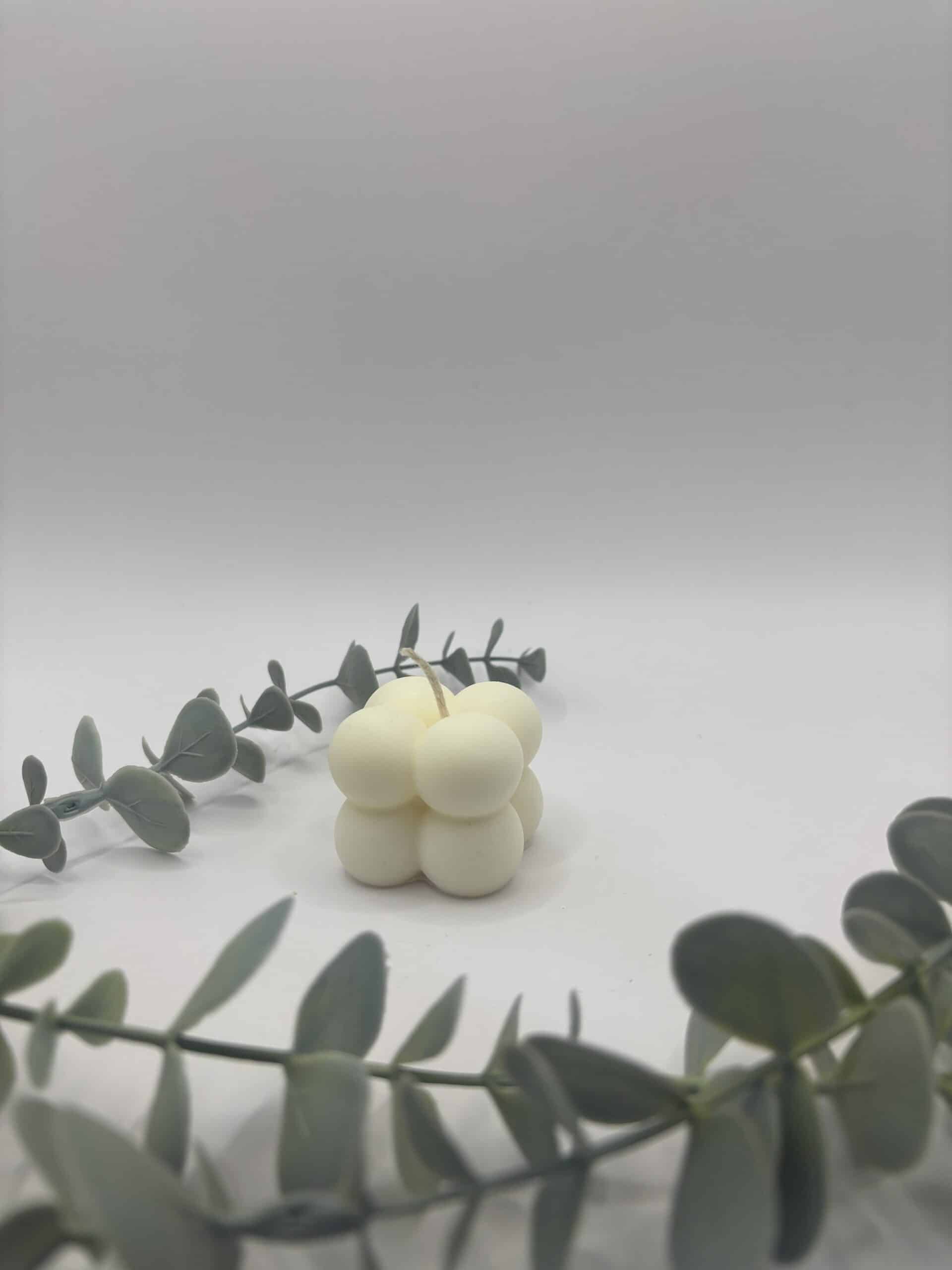 Een witte kaars in de vorm van een kleine kubus met bolletjes.
