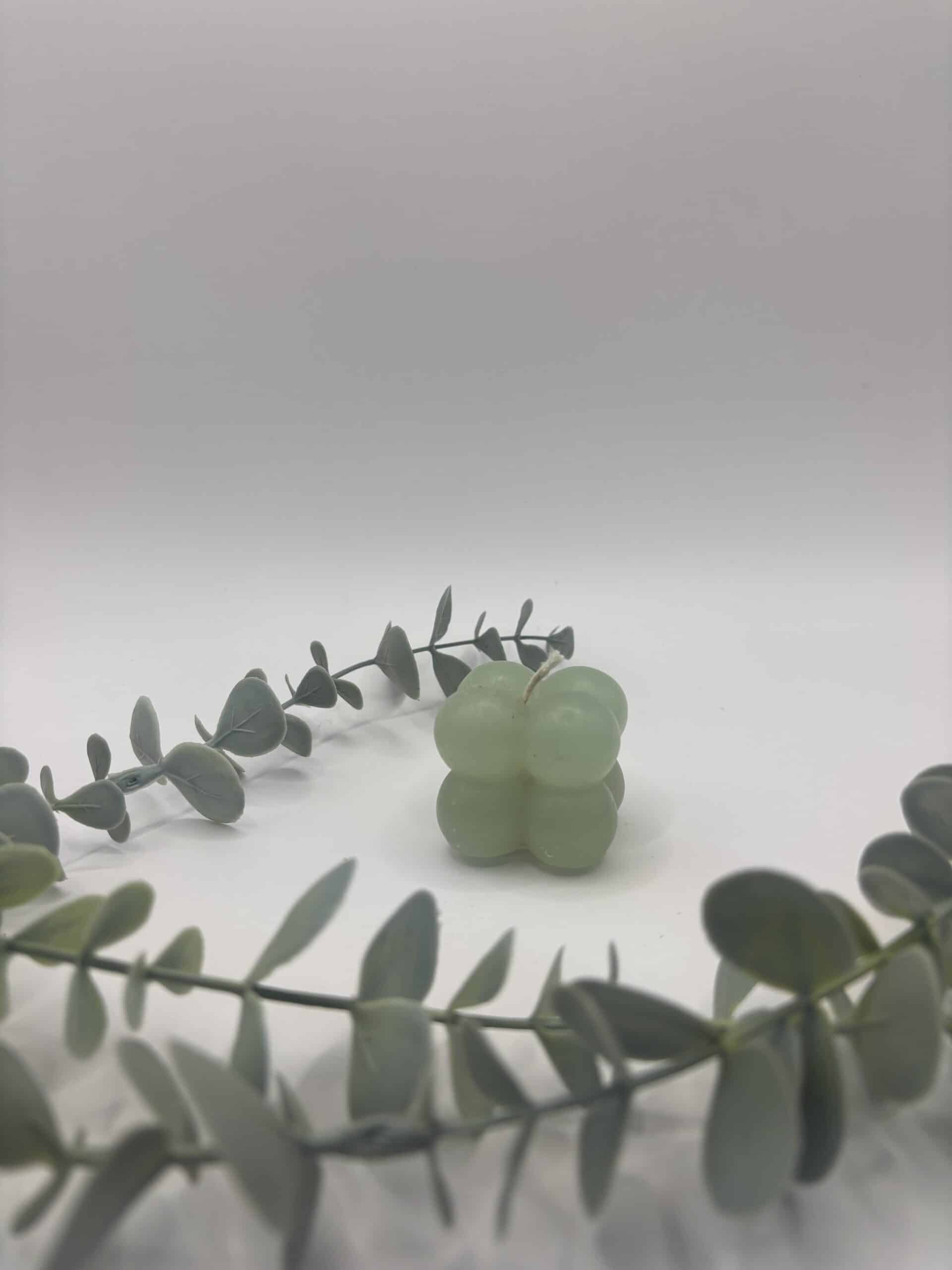 Een groene kaars in de vorm van een kleine kubus met bolletjes.