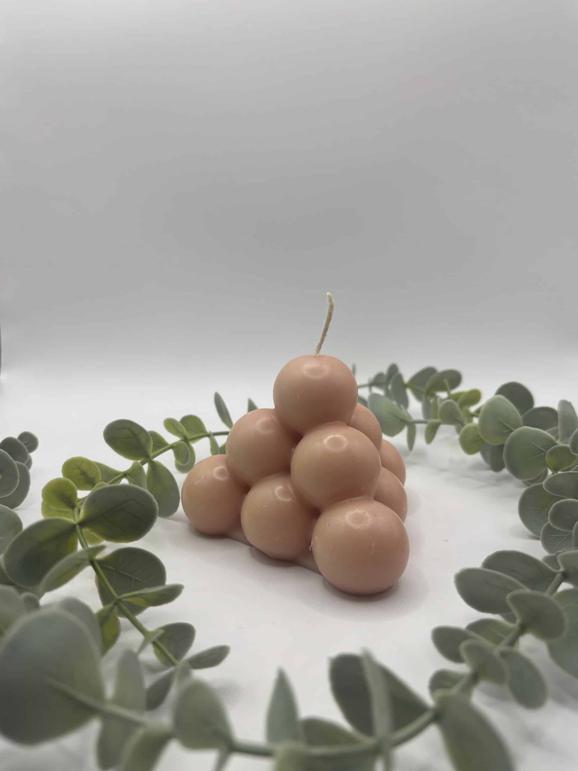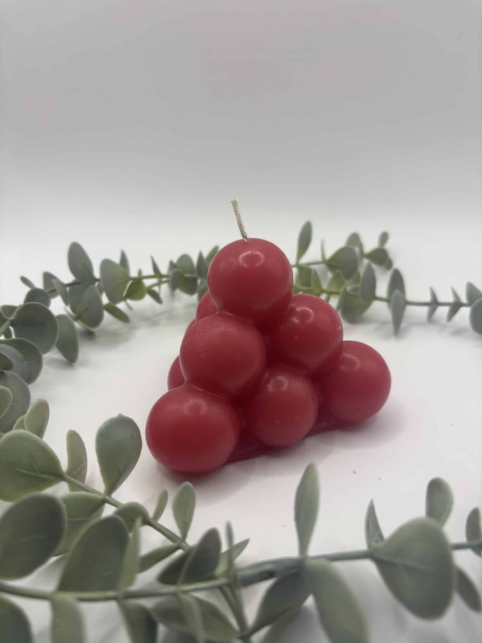 Een rode kaars in de vorm van een grote piramide bestaande uit bolletjes.