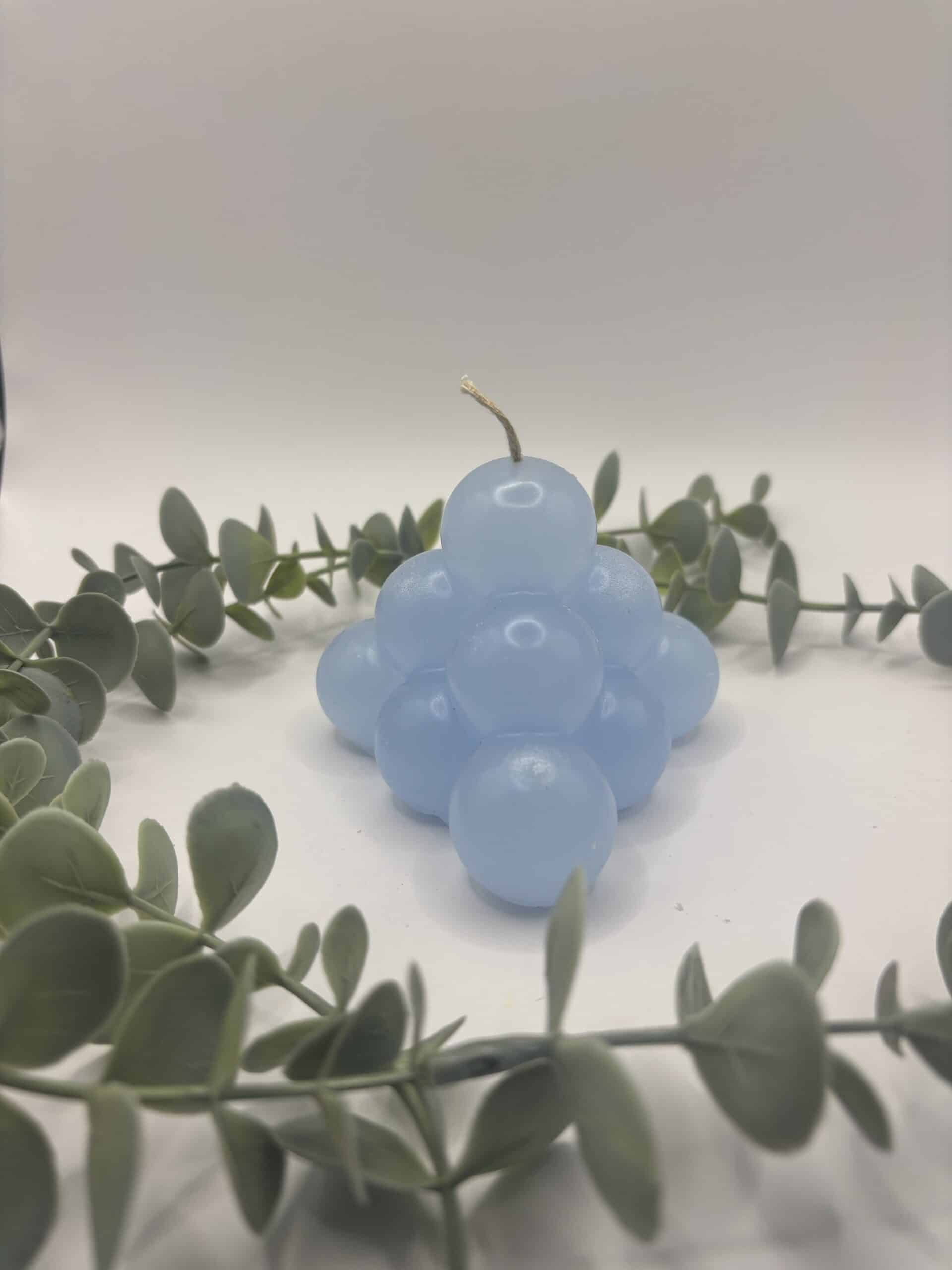 Een licht blauwe kaars in de vorm van een grote piramide bestaande uit bolletjes.