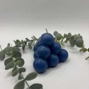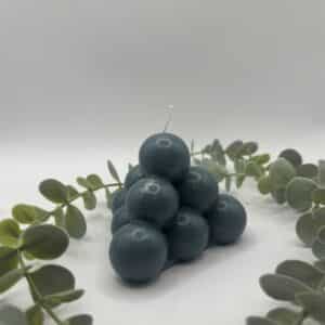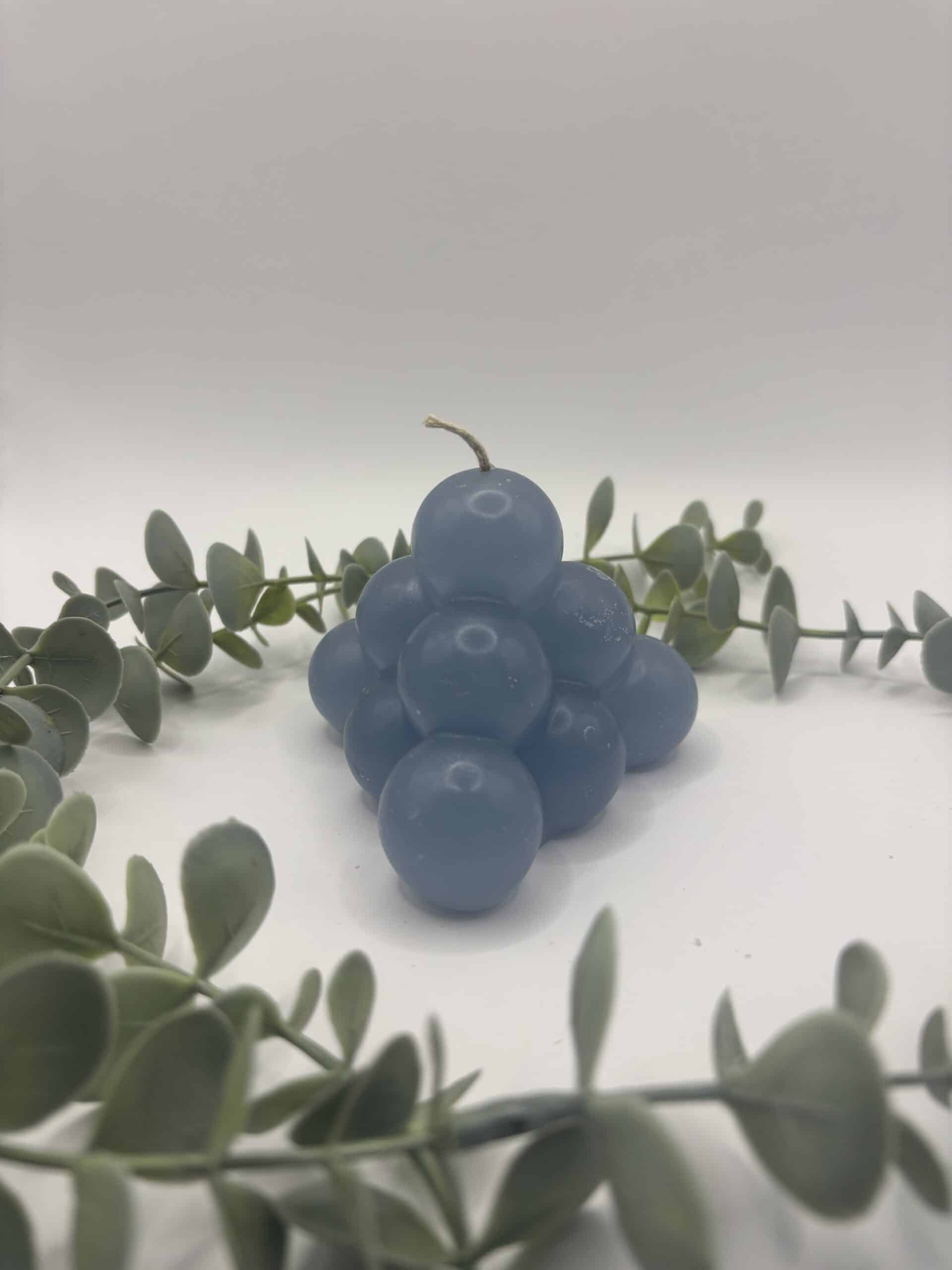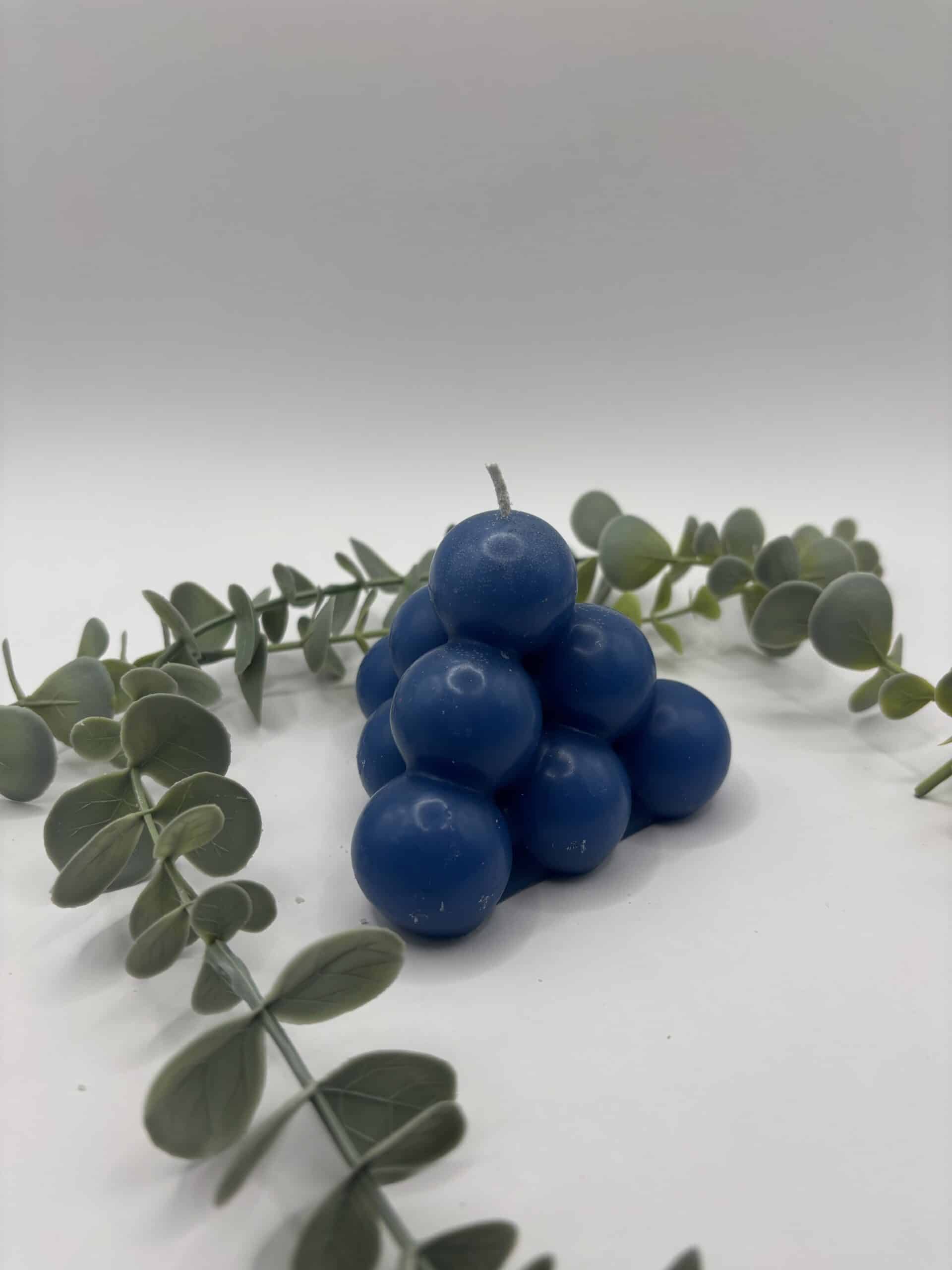 Een blauwe kaars in de vorm van een grote piramide bestaande uit bolletjes.