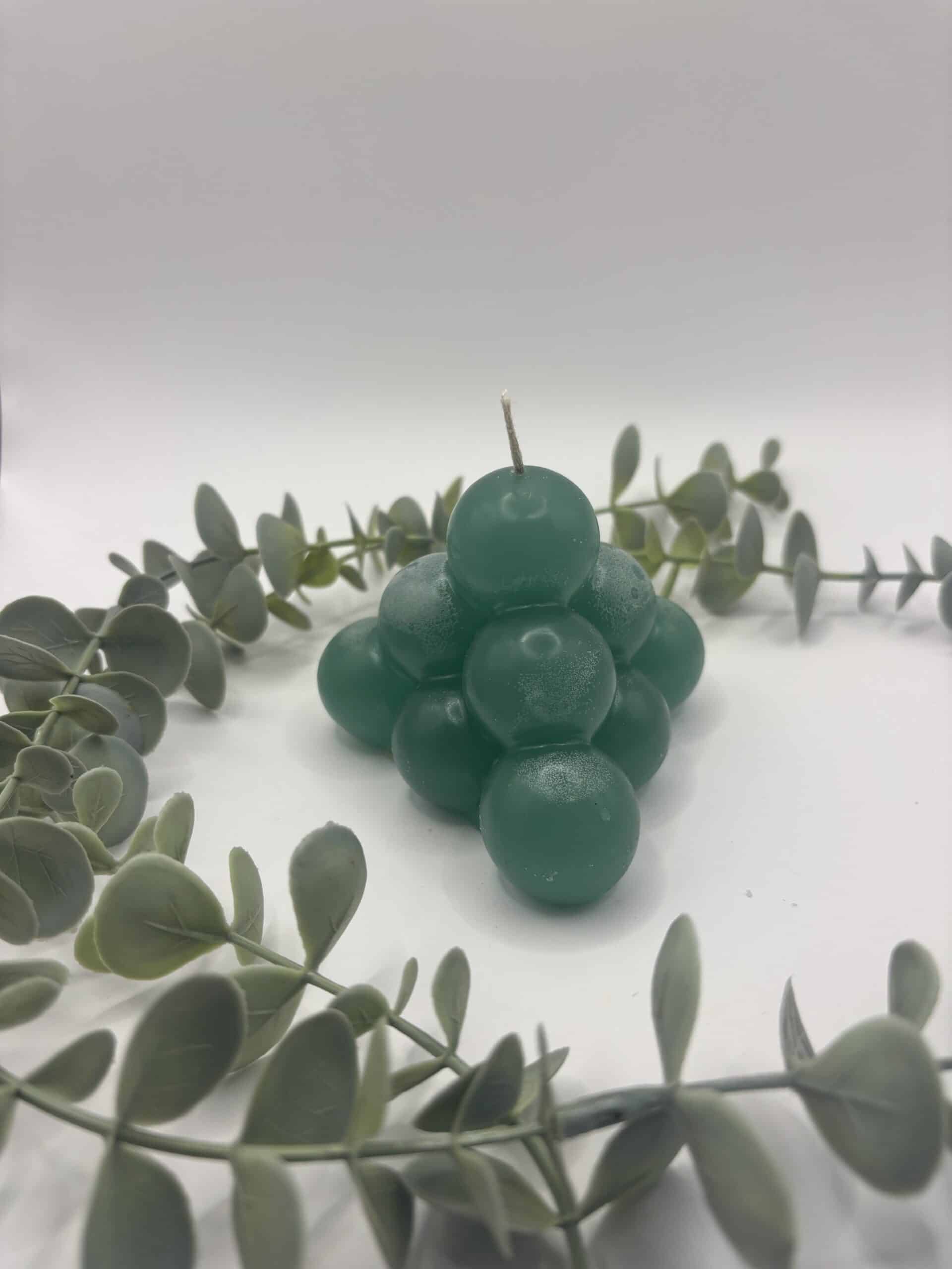 Een groene kaars in de vorm van een grote piramide bestaande uit bolletjes.