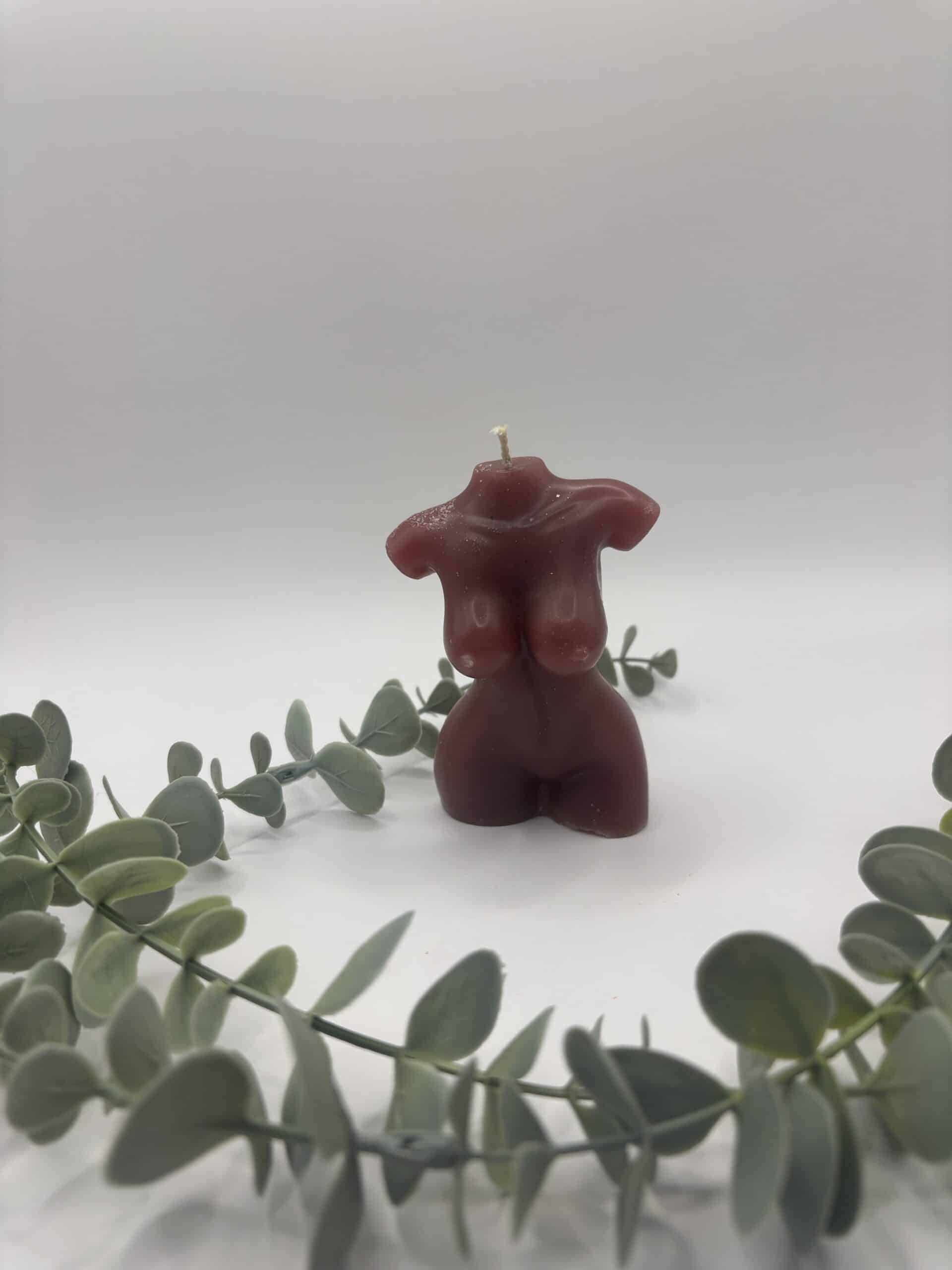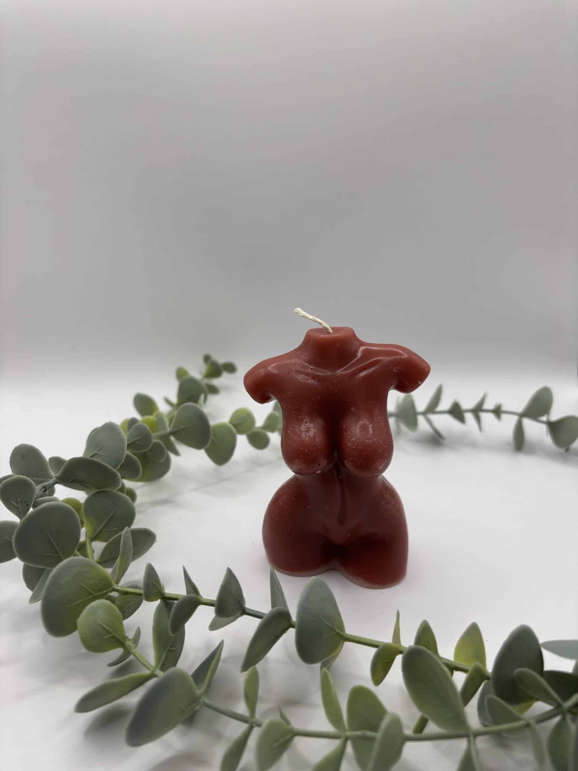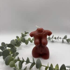Een bruine kaars in de vorm van een buste van een dame met schouders.