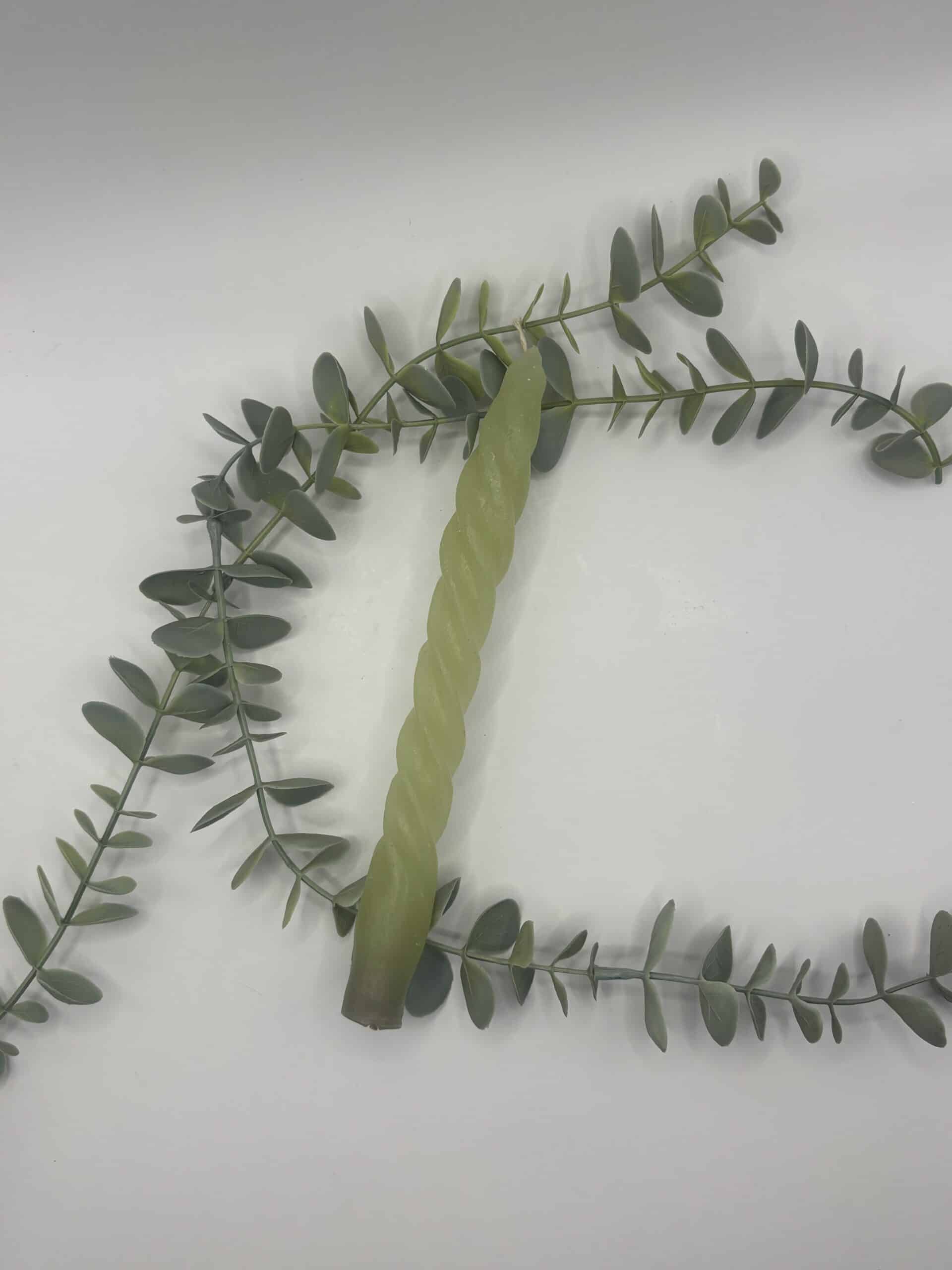 Een gif groene kaars voor een kandelaar met een smalle krul in.