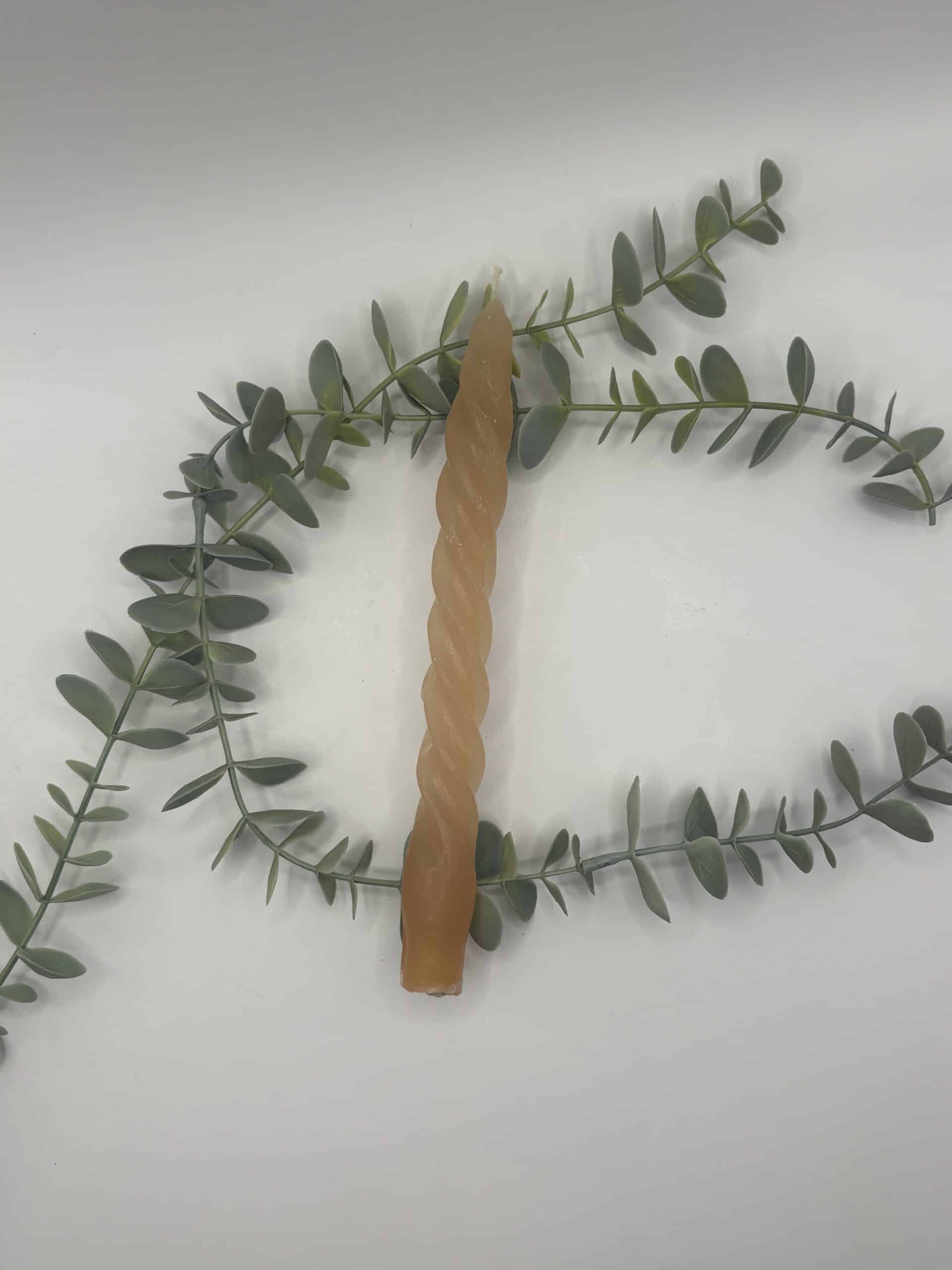 Een oranje kaars voor een kandelaar met een smalle krul in.
