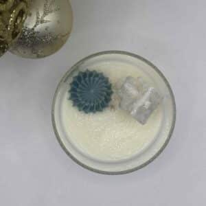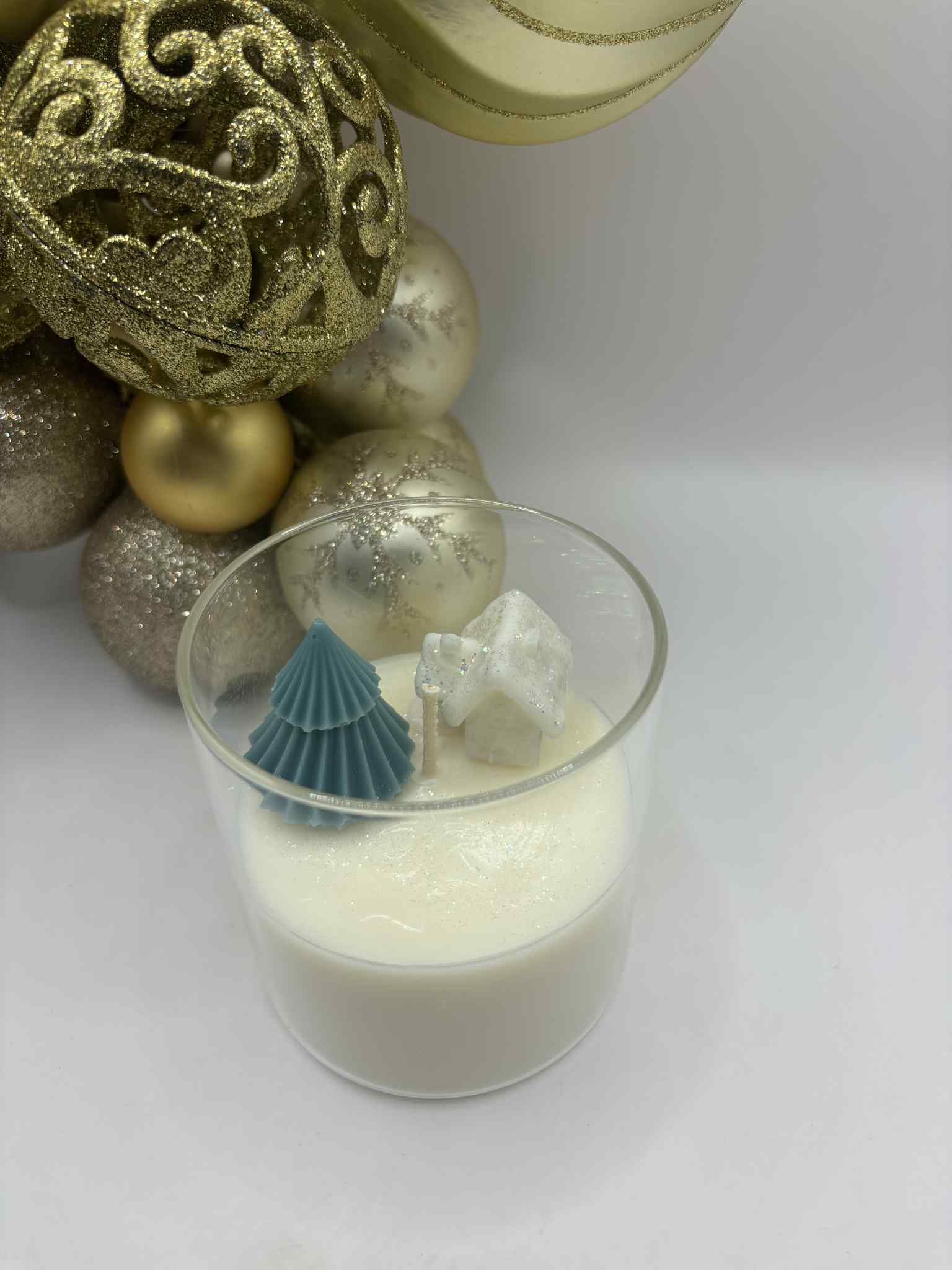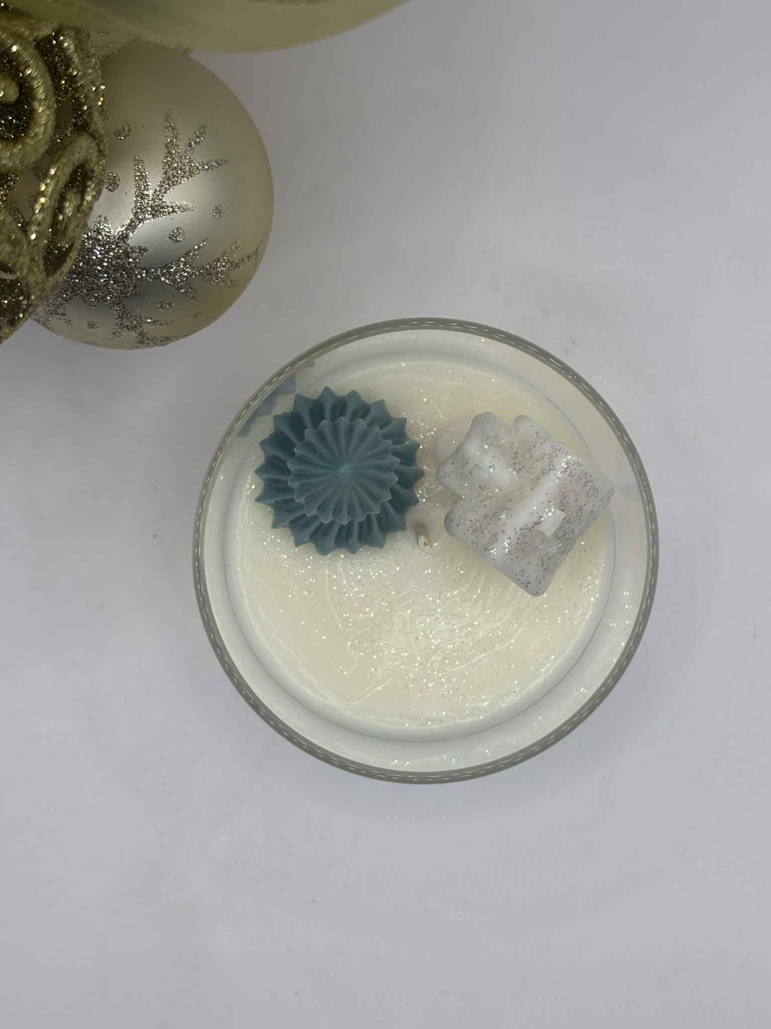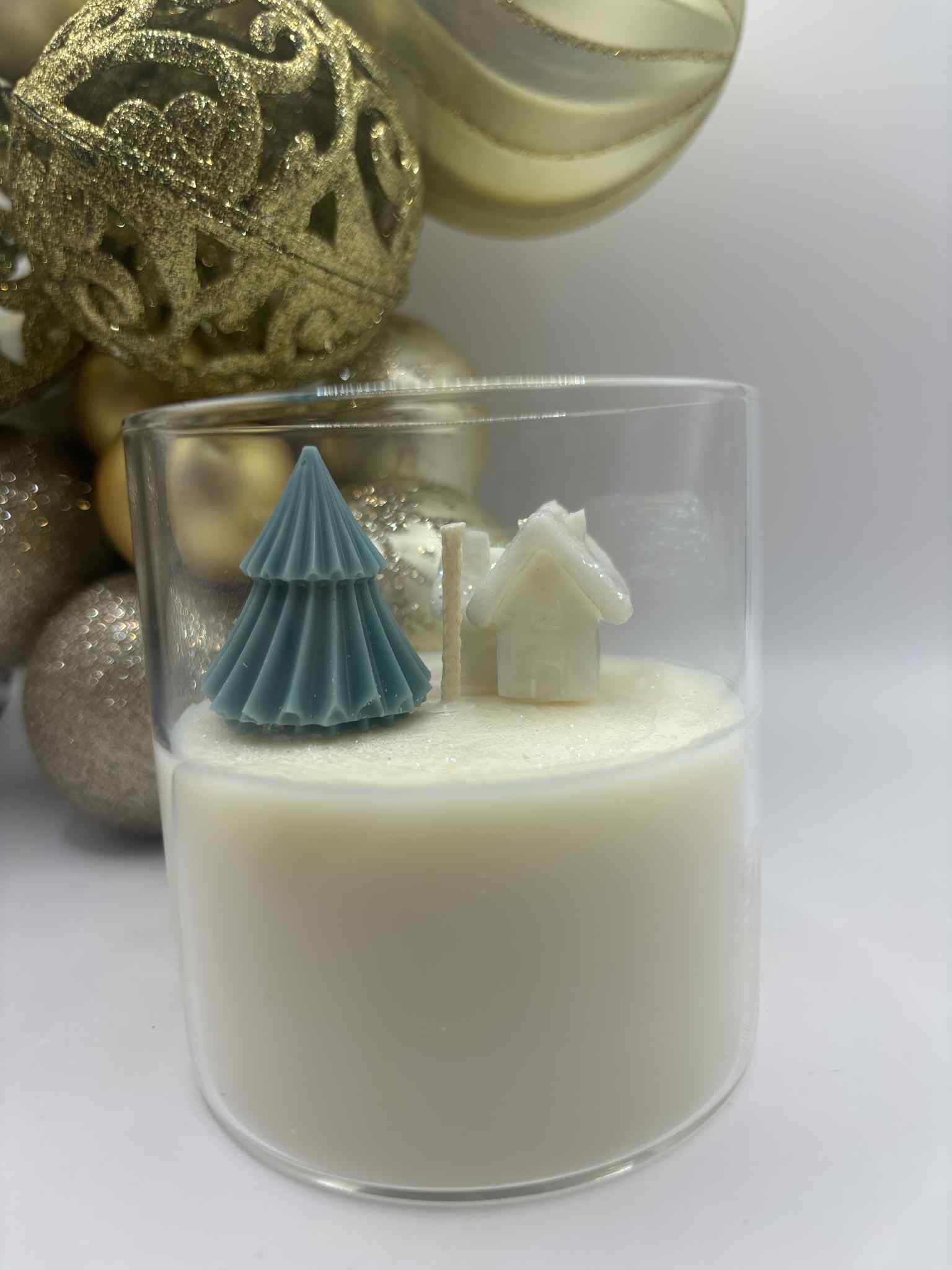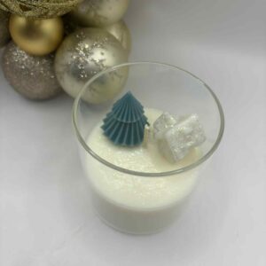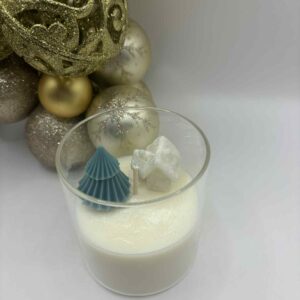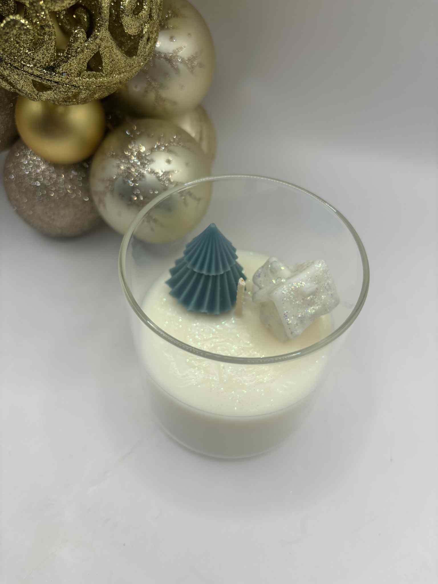 Deze kaars is gemaakt uit soyawas met onze happy vanilla geur en afgewerkt met kerstdecoratie.