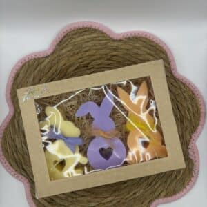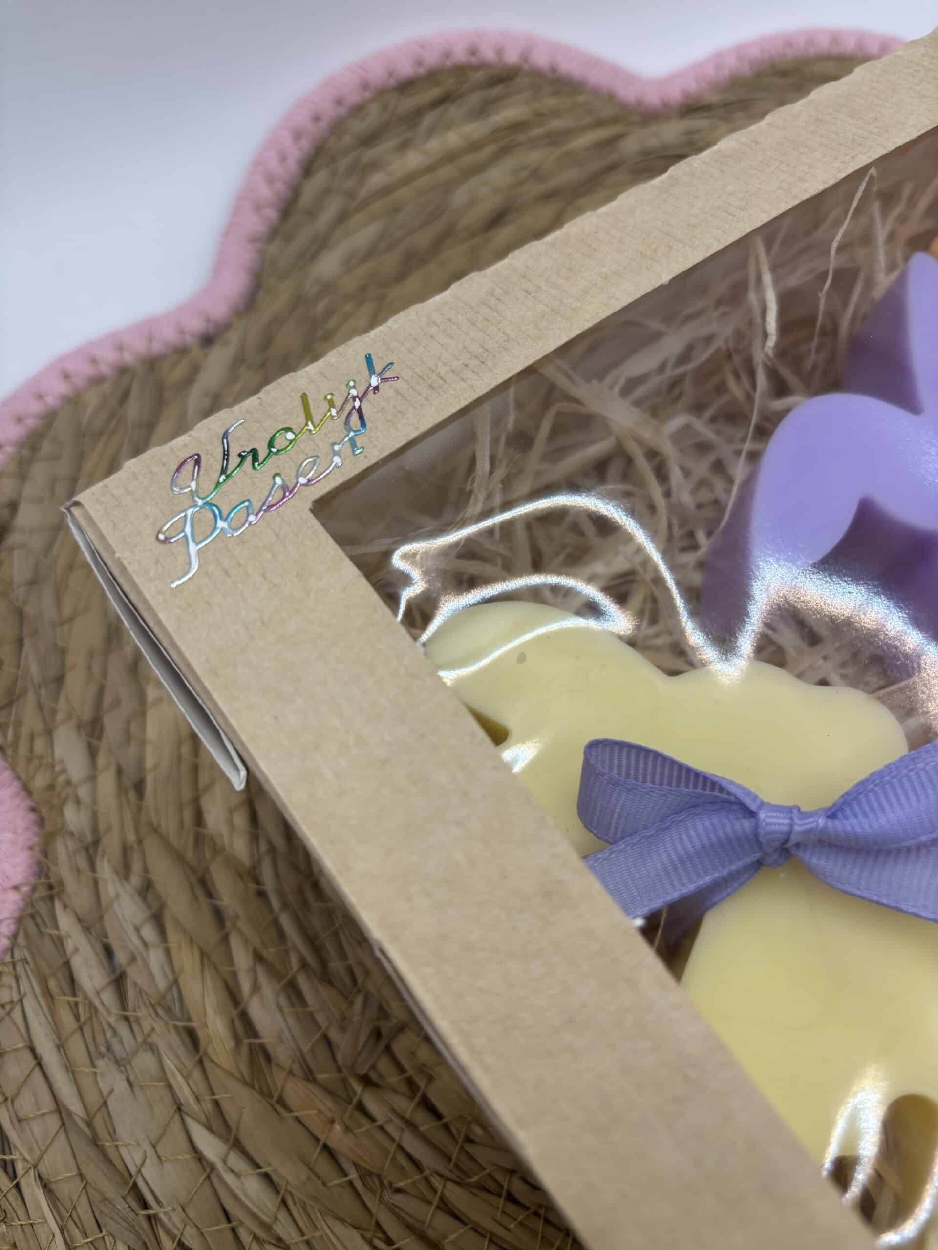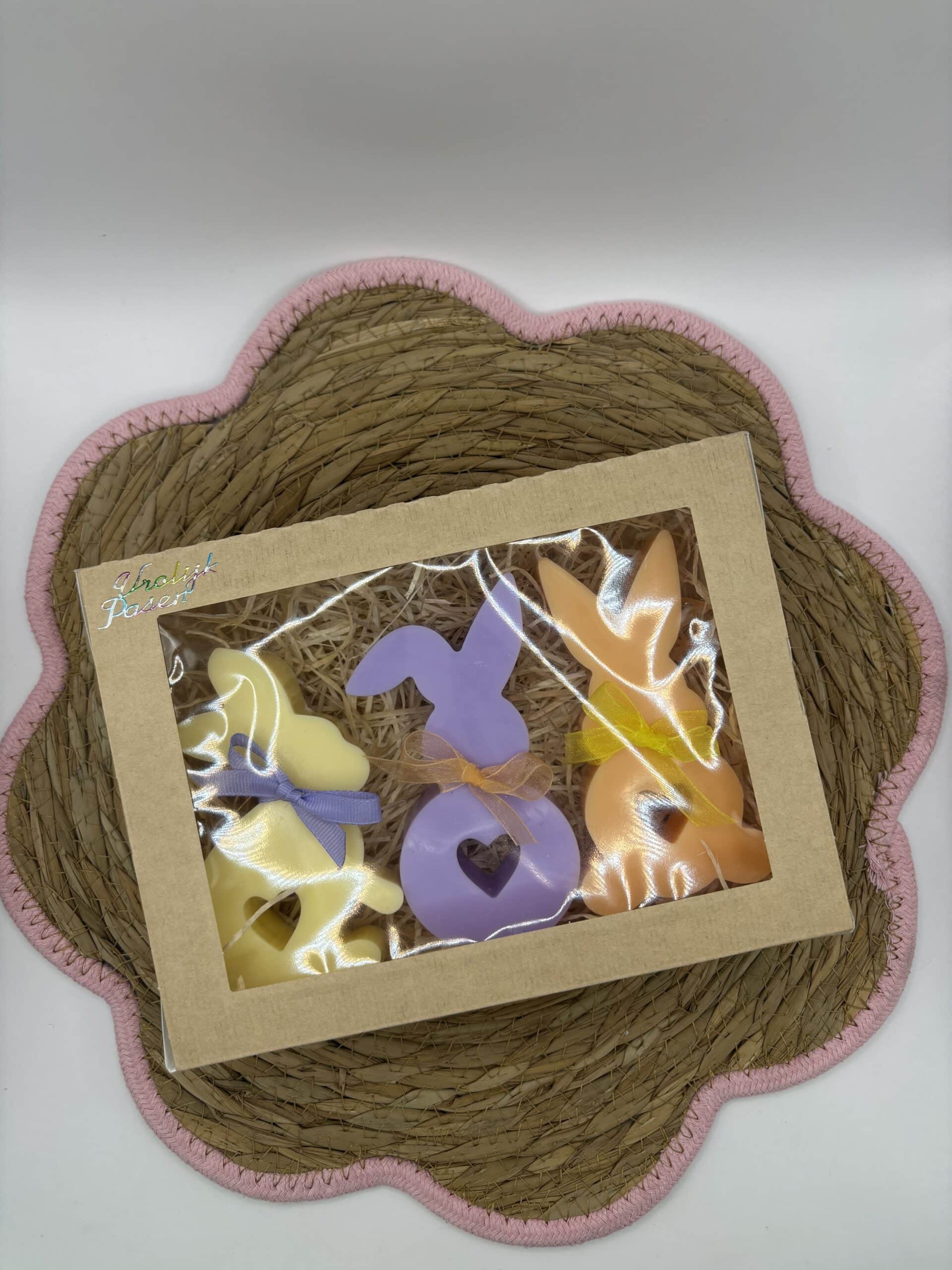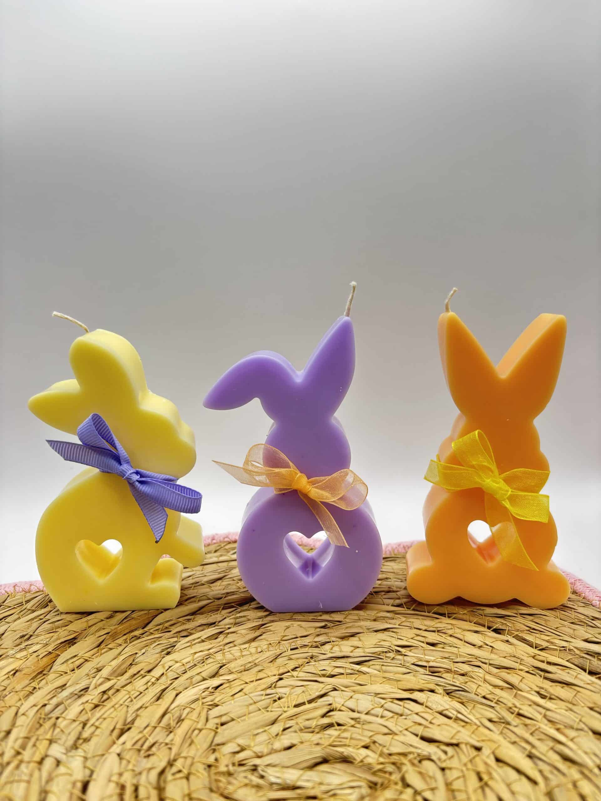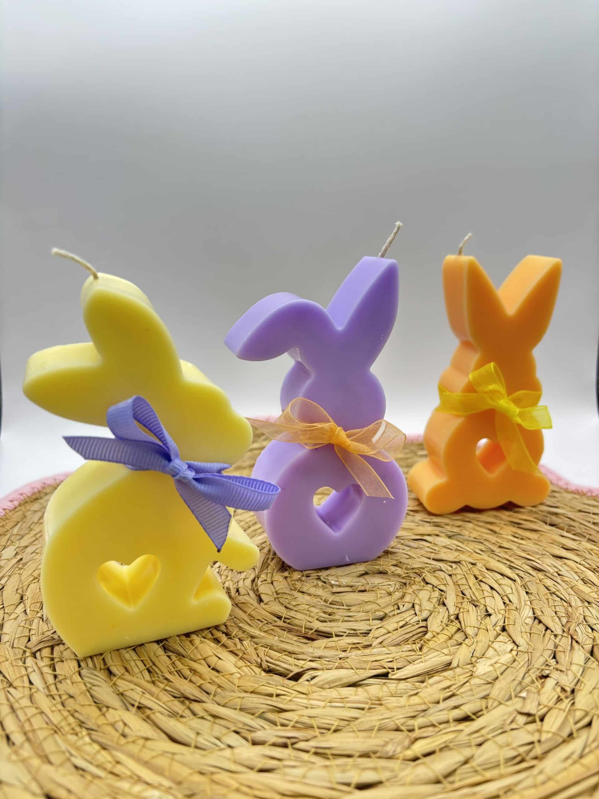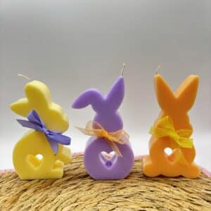 Deze set bestaat uit 3 kaarsen in de vorm van paashazen (pastel oranje, lila en geel).