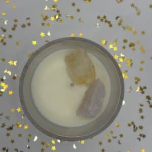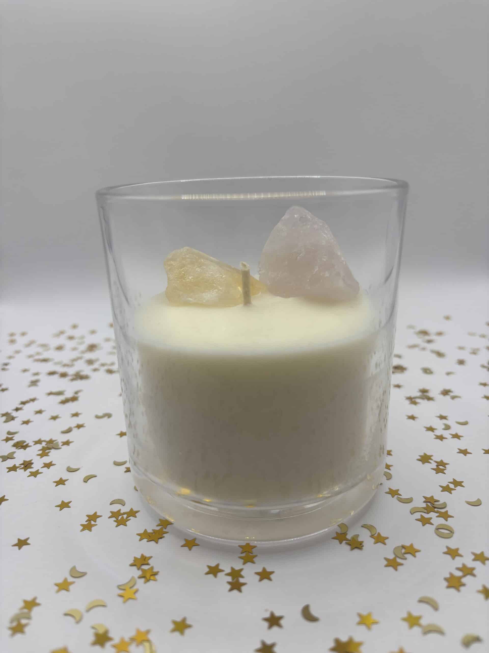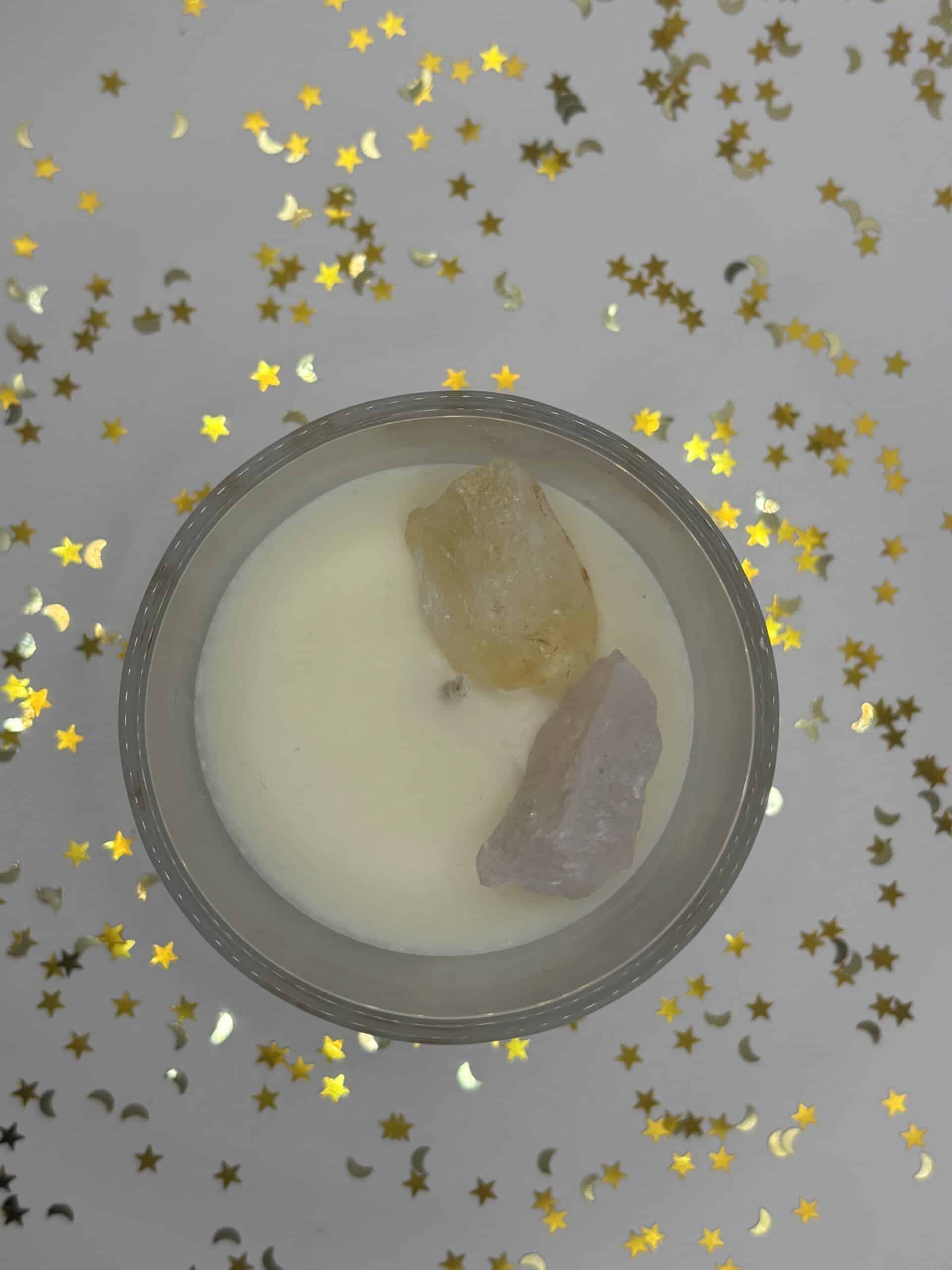 De kaars bevat echte edelstenen, namelijk een ruwe citrien en rozenkwarts. Deze kunt u gemakkelijk verwijderen als het kaarsvet gesmolten is.