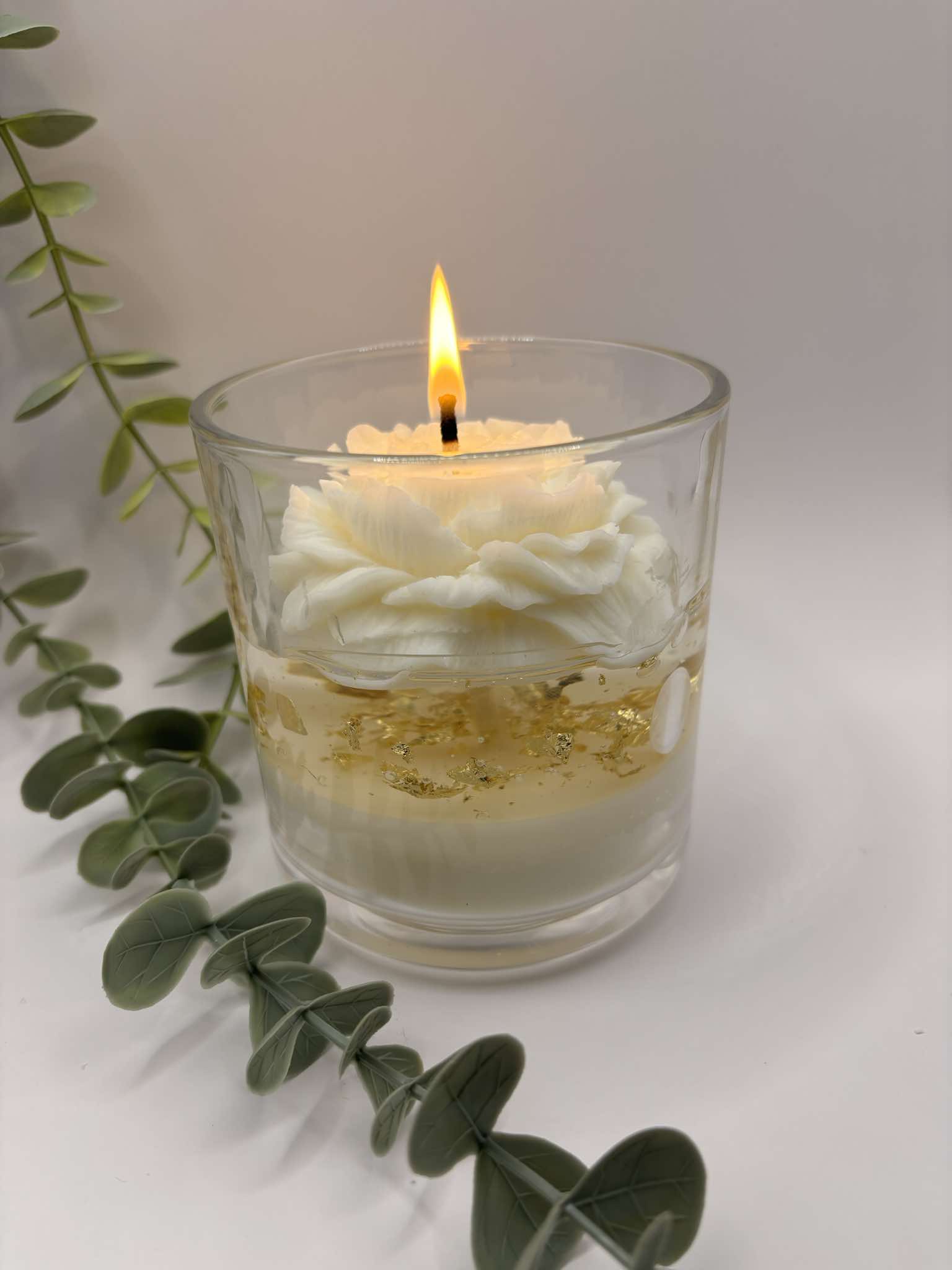 De lagen bestaan uit wit sojawas, kaarsen-gel met gouden schilfers en een witte pioenkaars als afwerking.