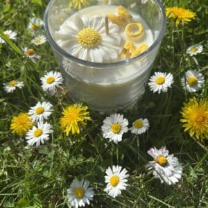 Kaars in doorzichtige glazen pot met goud deksel. Onderste laag is wit kaarsvet dat ruikt naar vanille. Er ligt een madeliefje bovenaan als versiering.