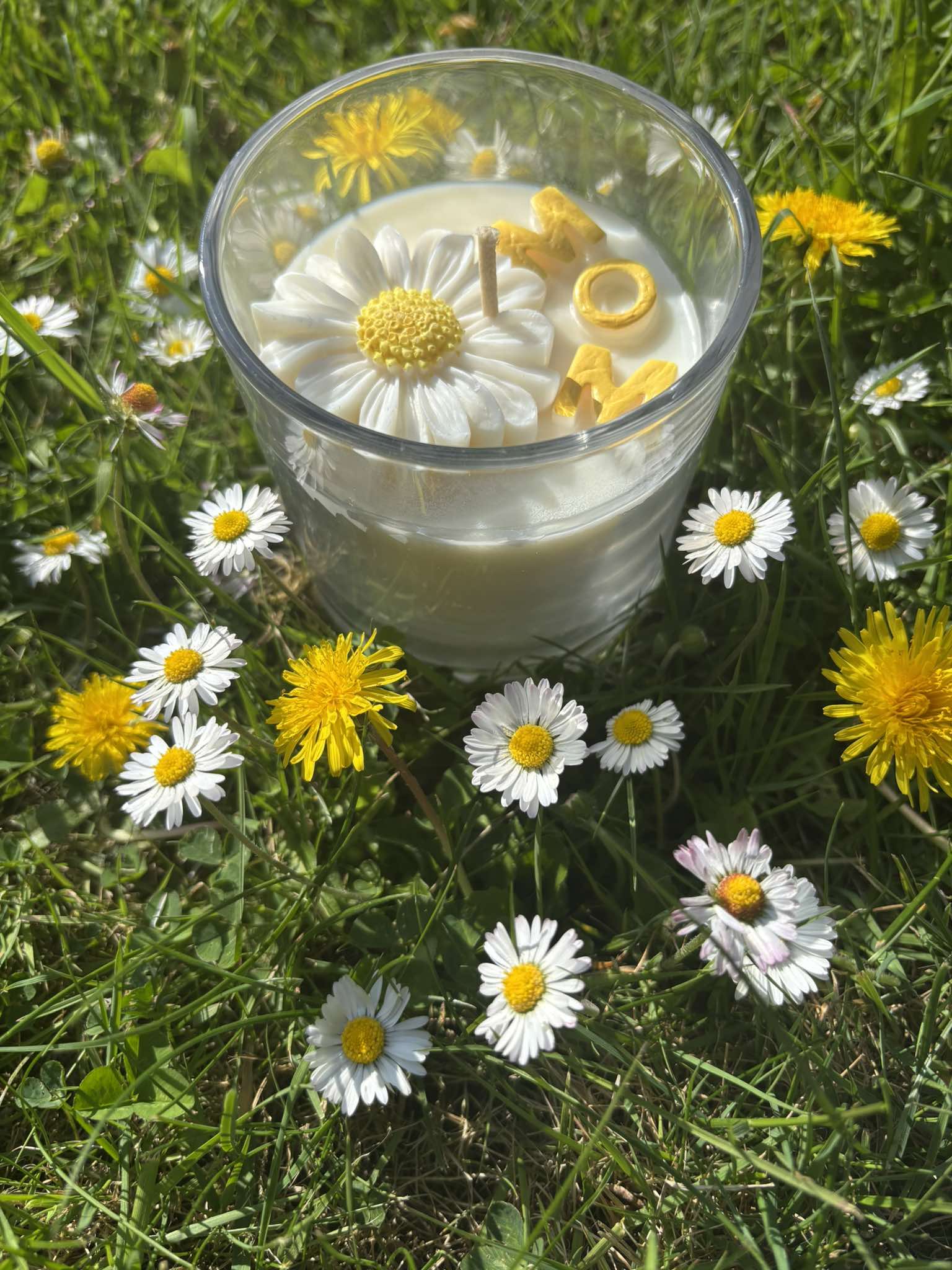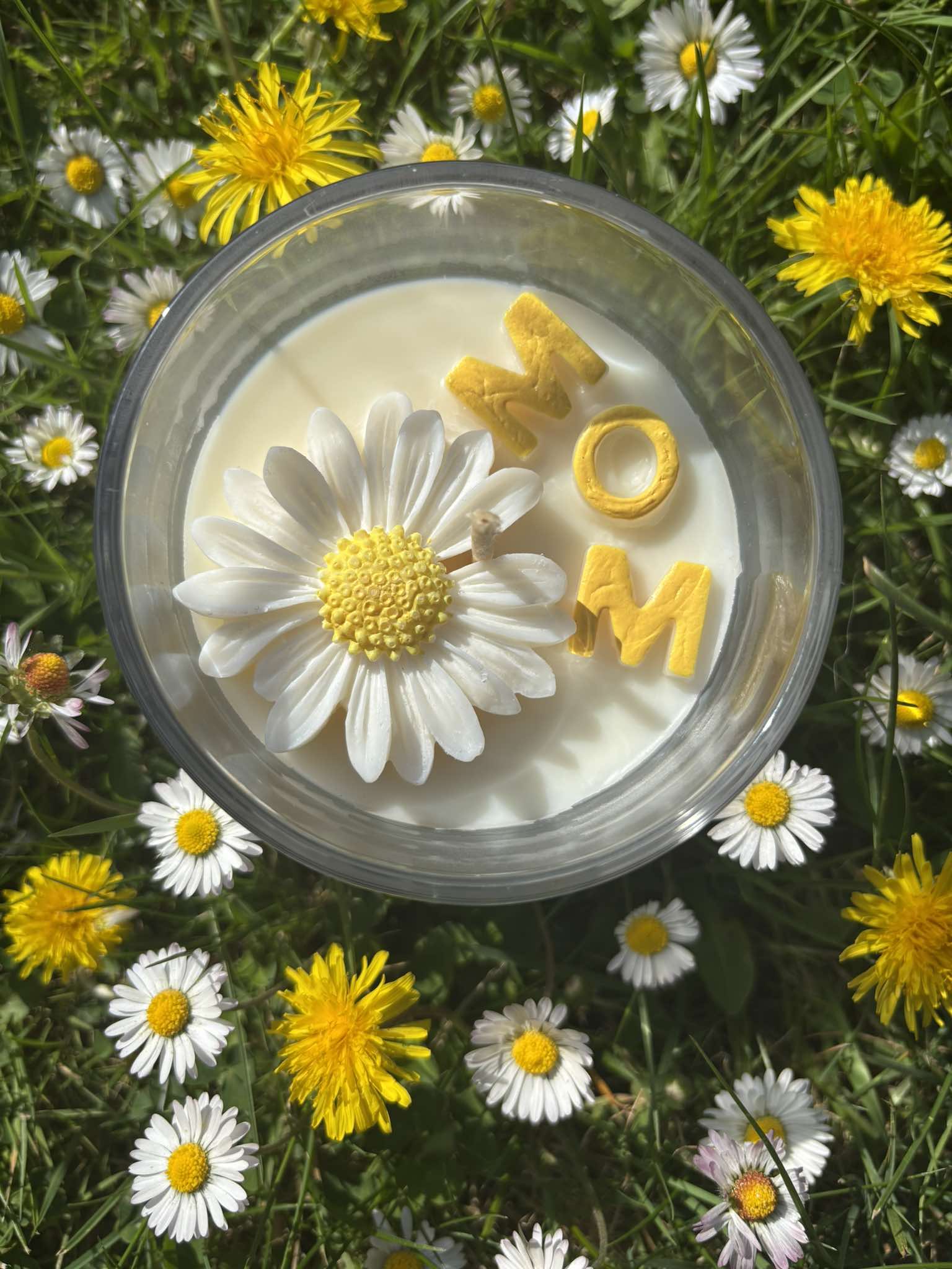 Het geef een zoete geur aan je thuis doordat de kaars bestaat uit witte sojawas met vanille geurolie. De kaars is afgewerkt met een margrietje en gele letters die het woord ‘MOM’ vormen. Deze zijn ook vervaardigd uit sojawas.