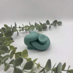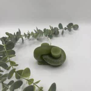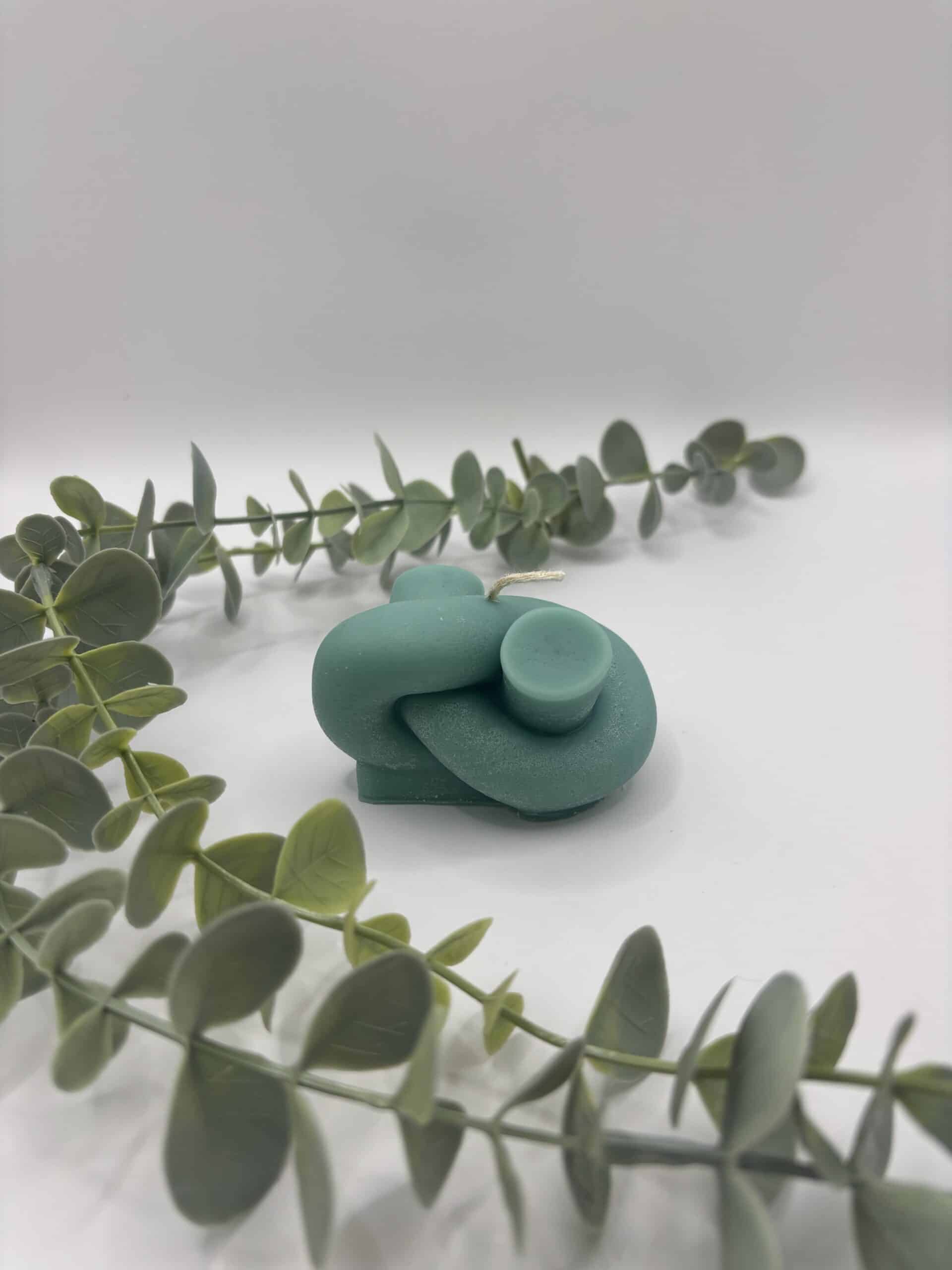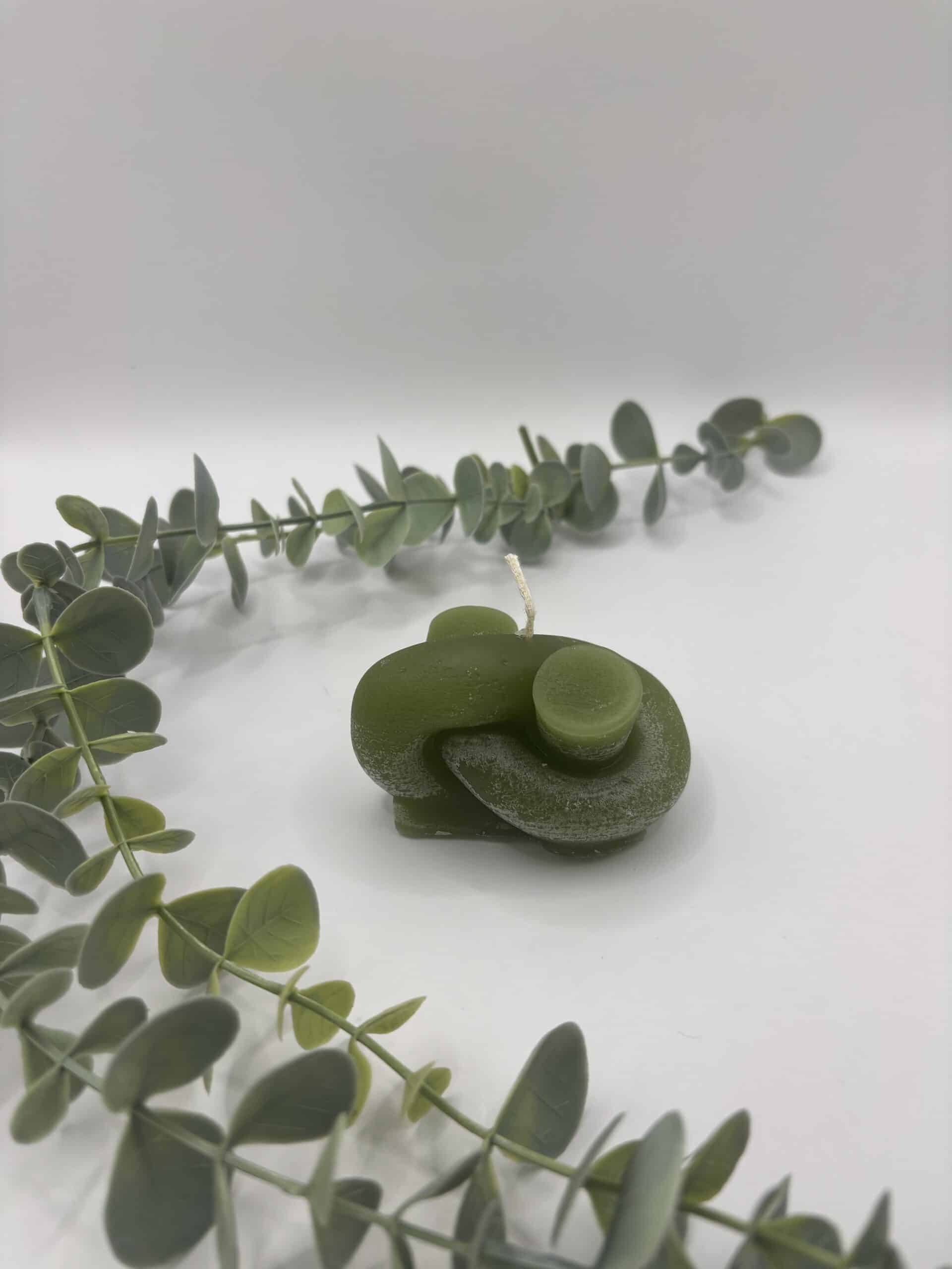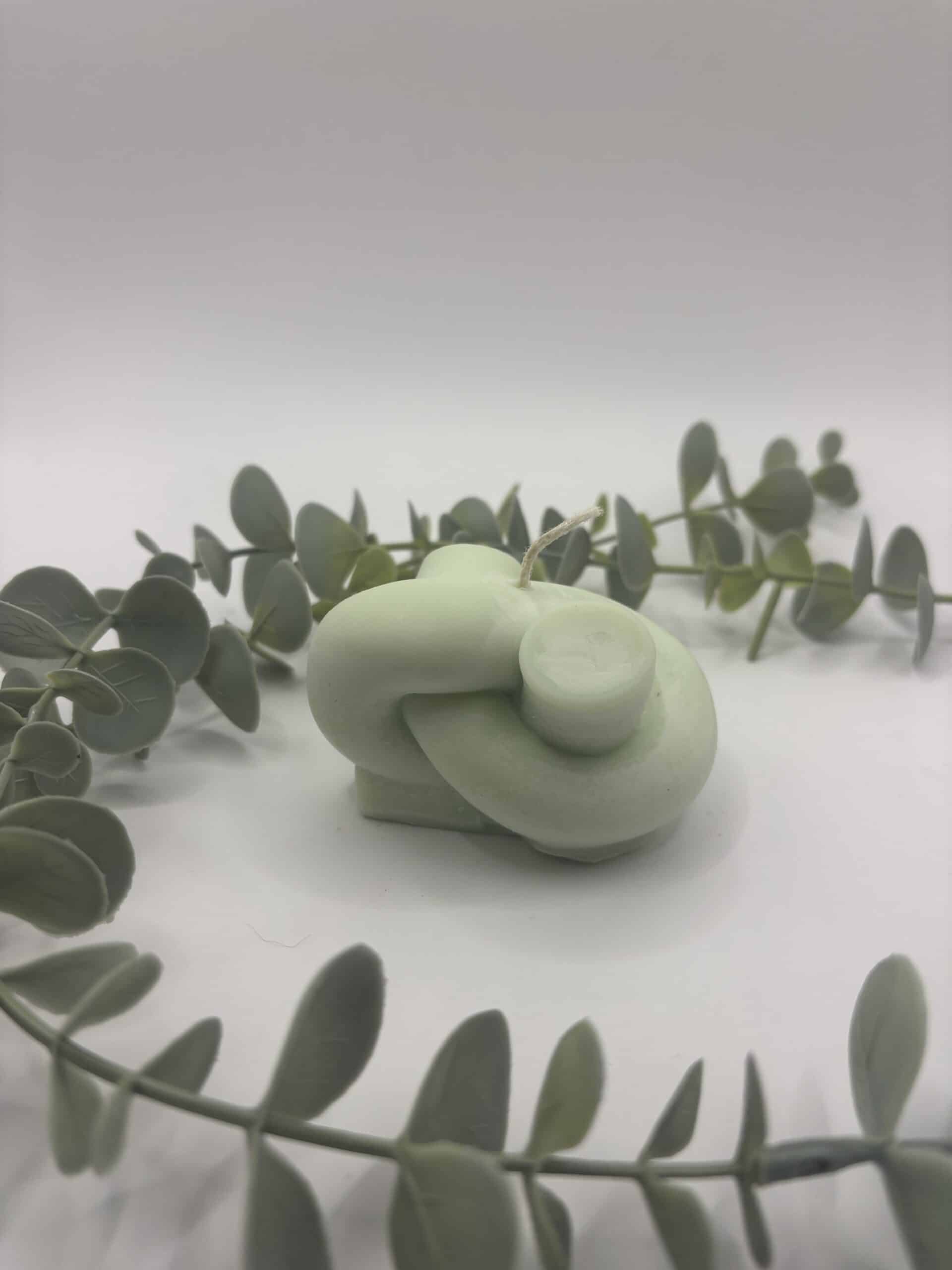 Een pistache kaars in de vorm van een platte knoop.