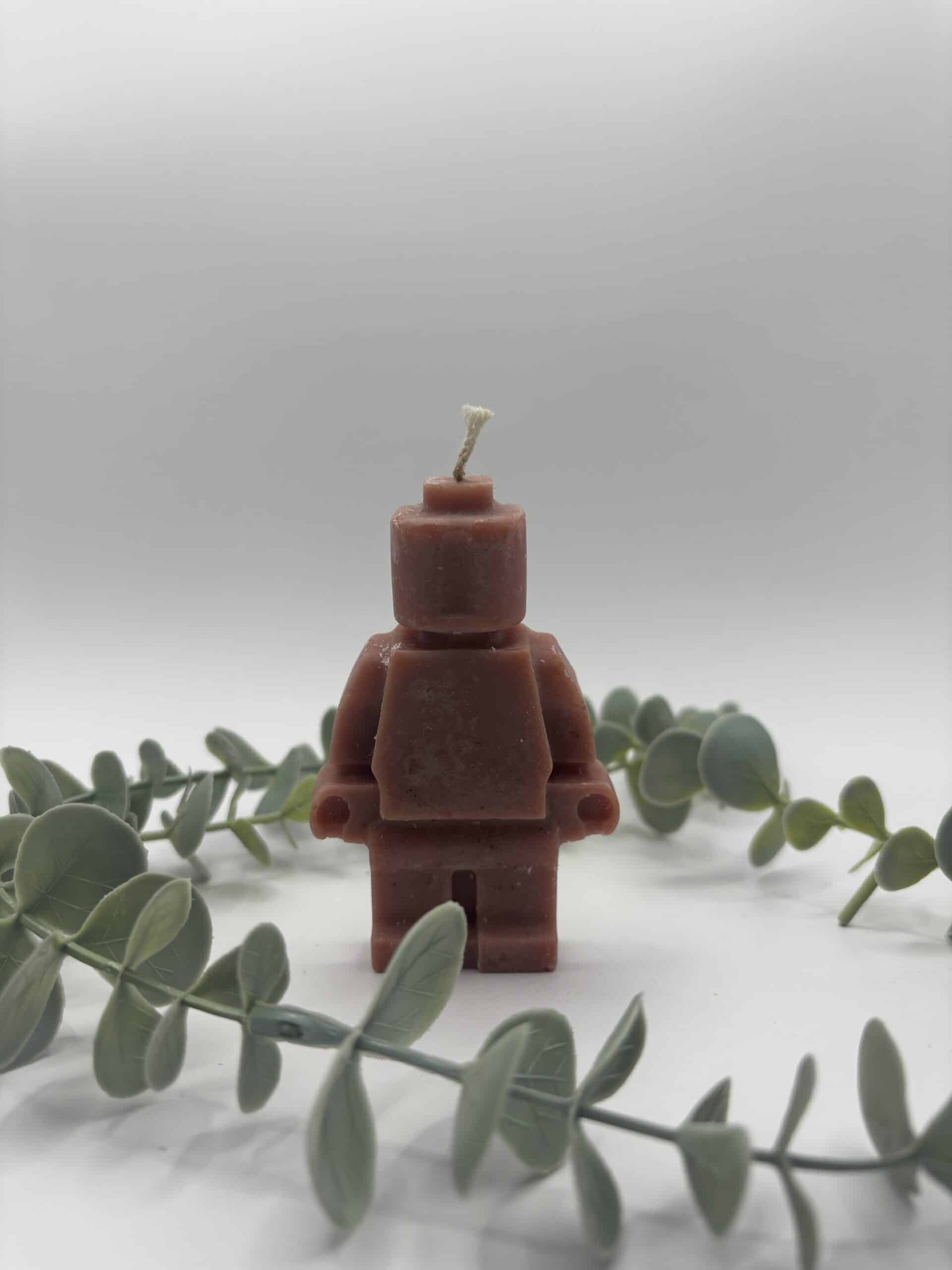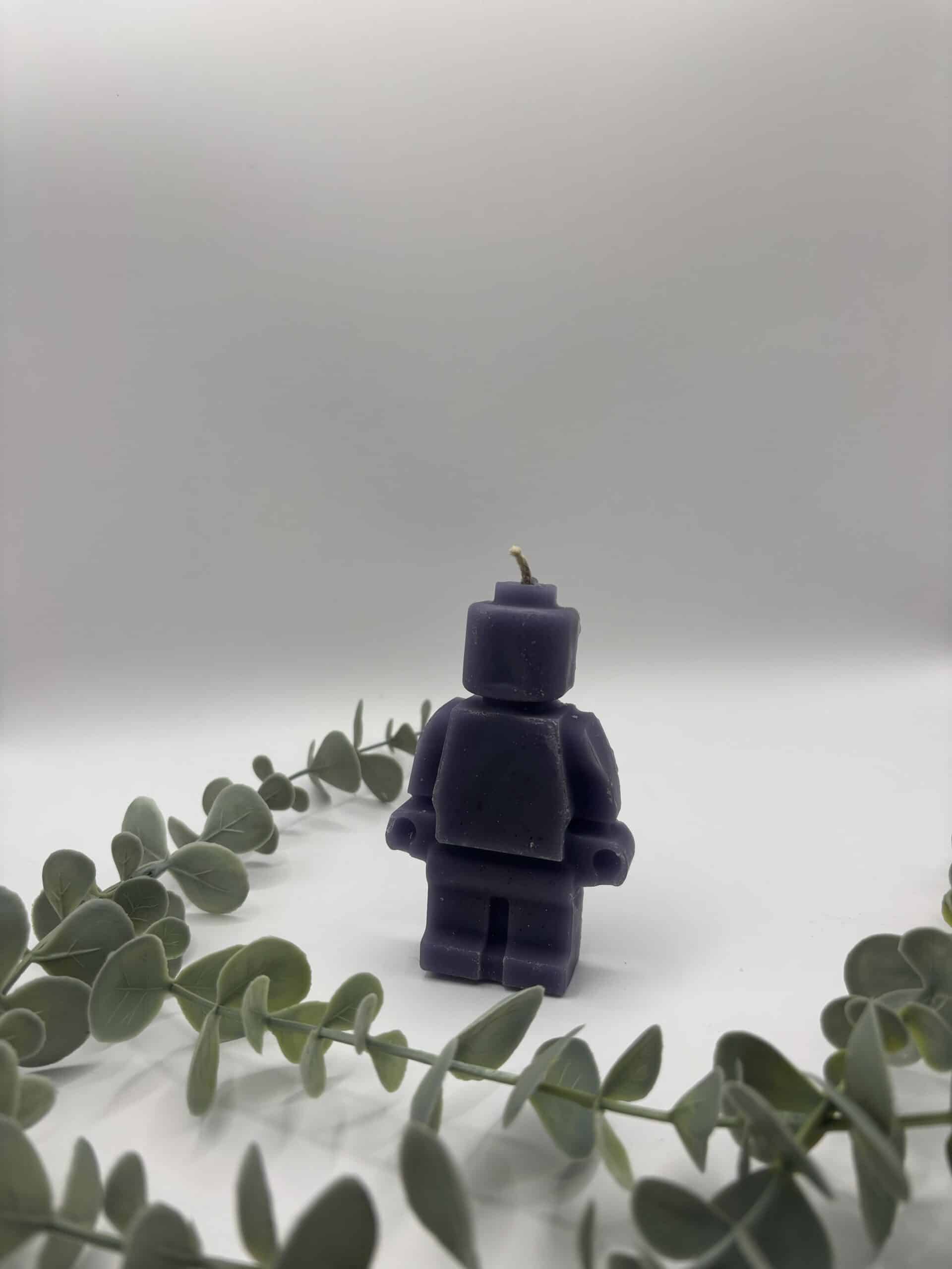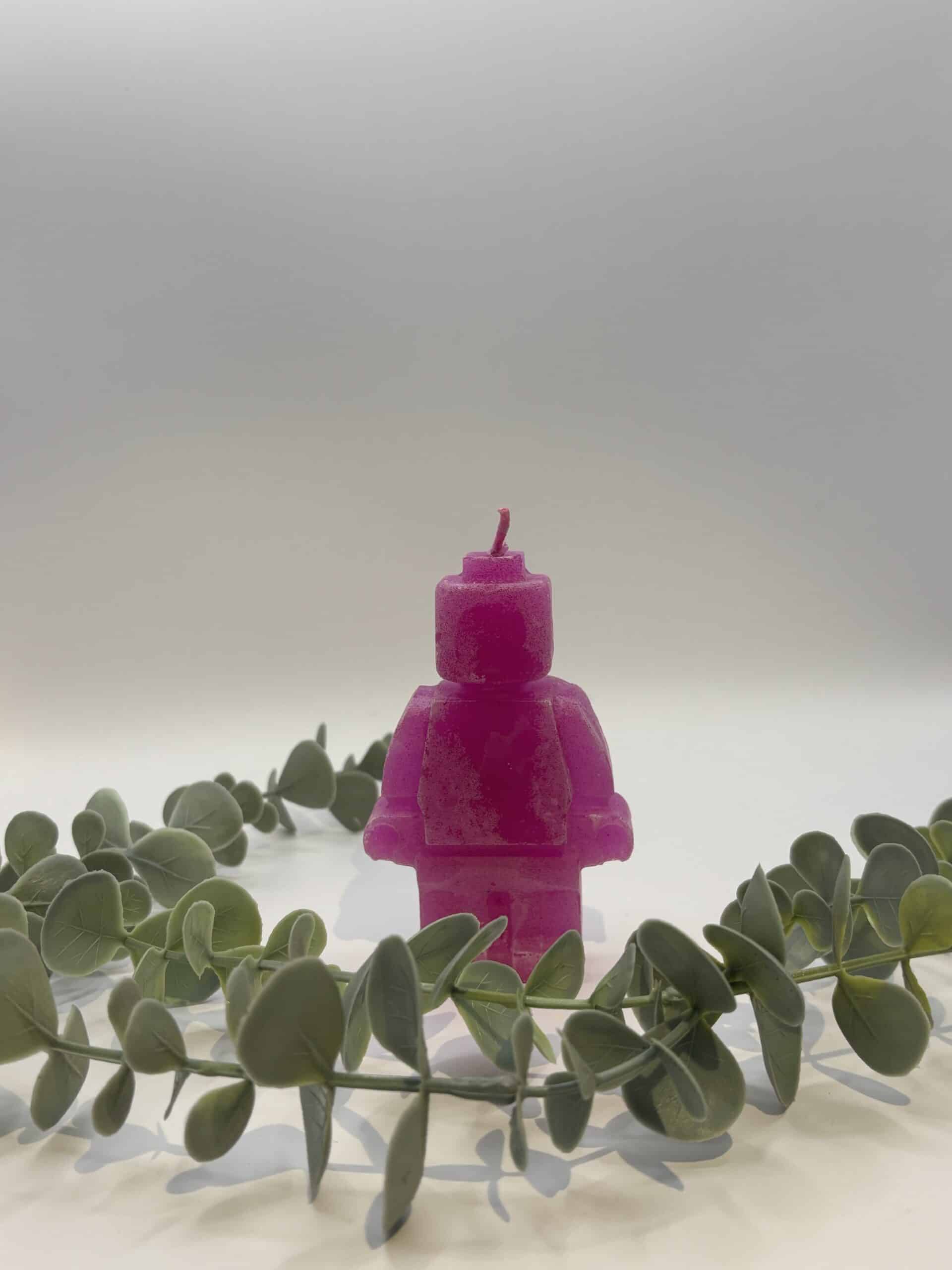 Een paarse kaars in de vorm van een legomannetje.