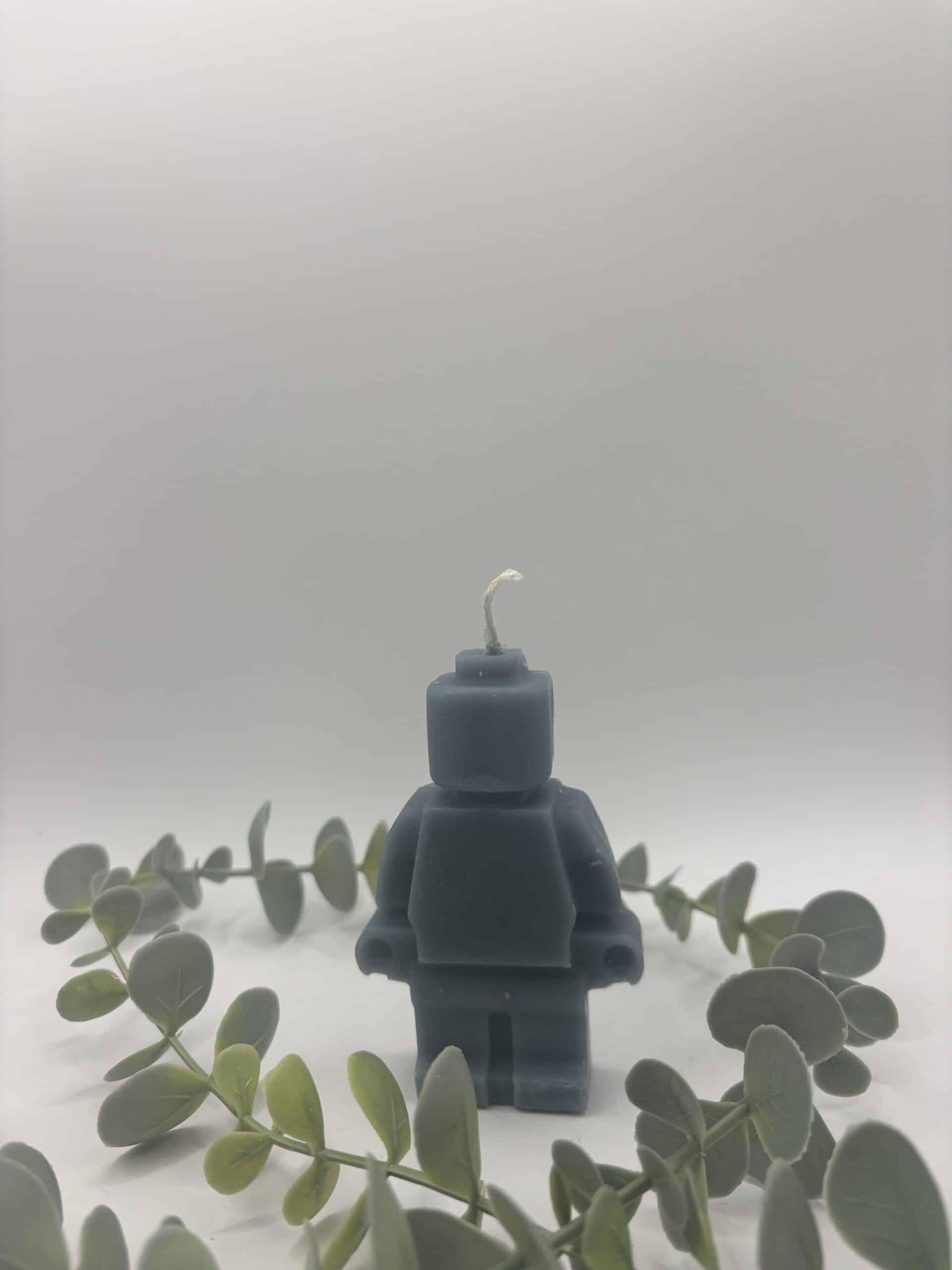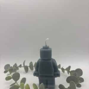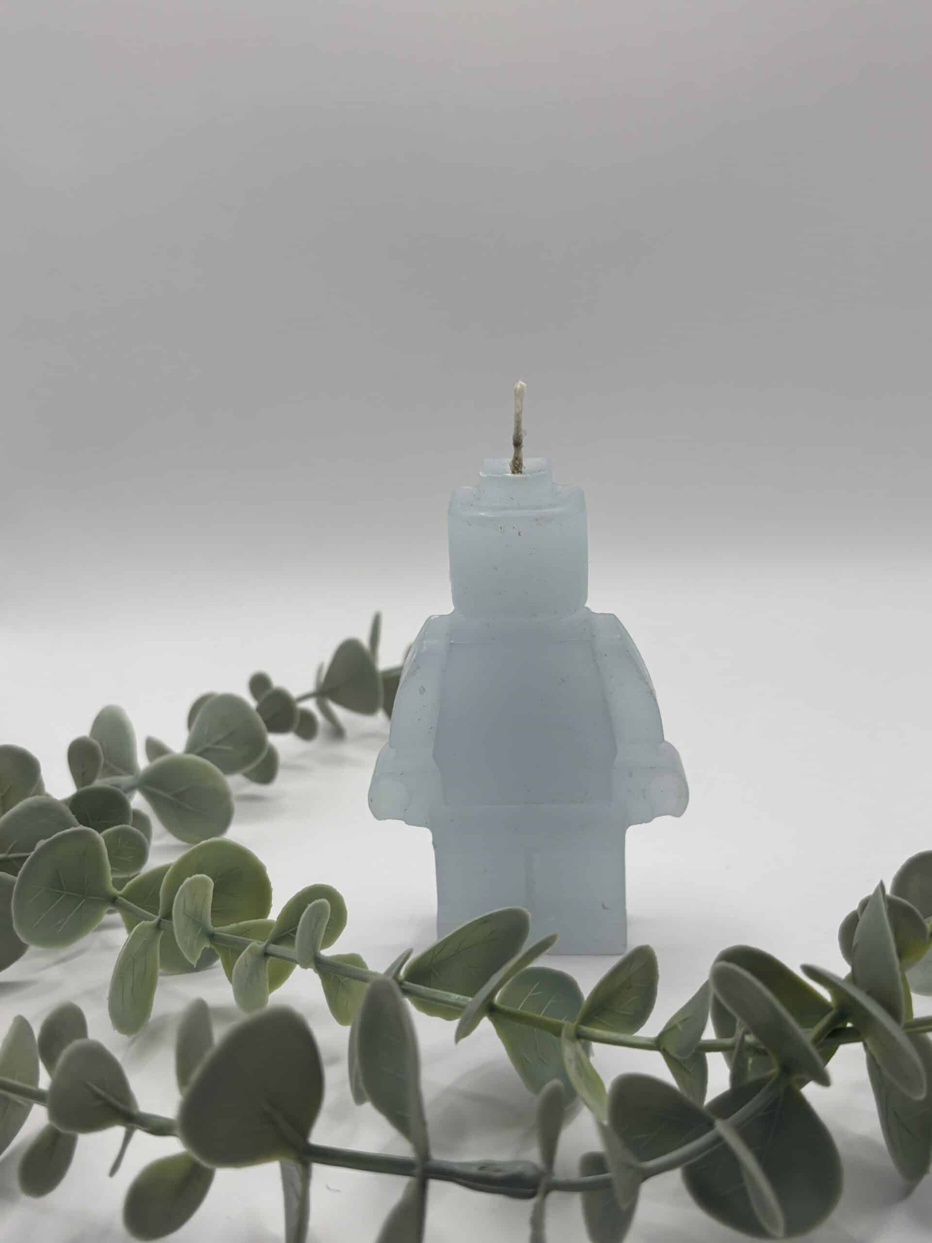 Een licht blauwe kaars in de vorm van een legomannetje.