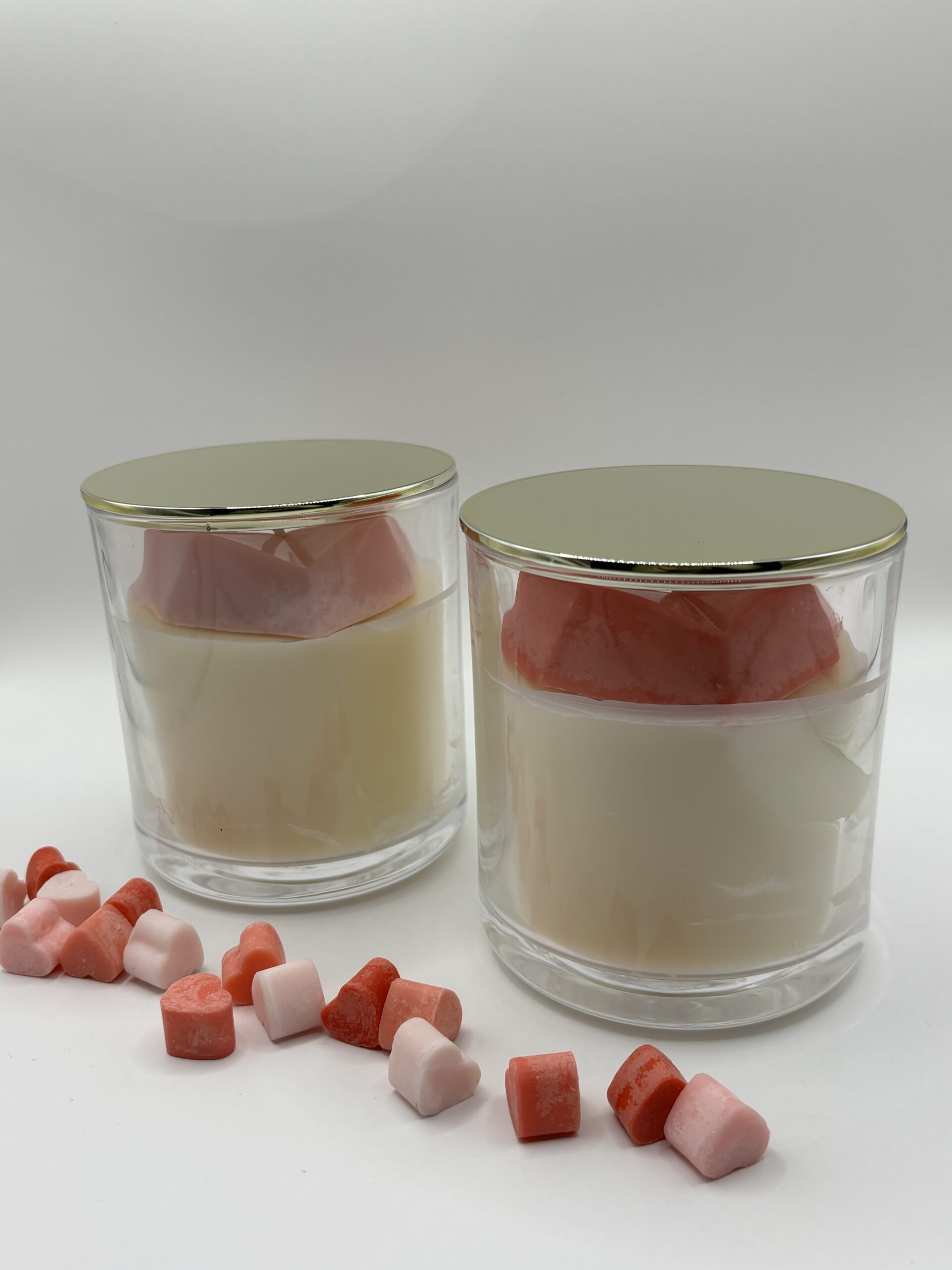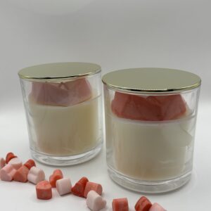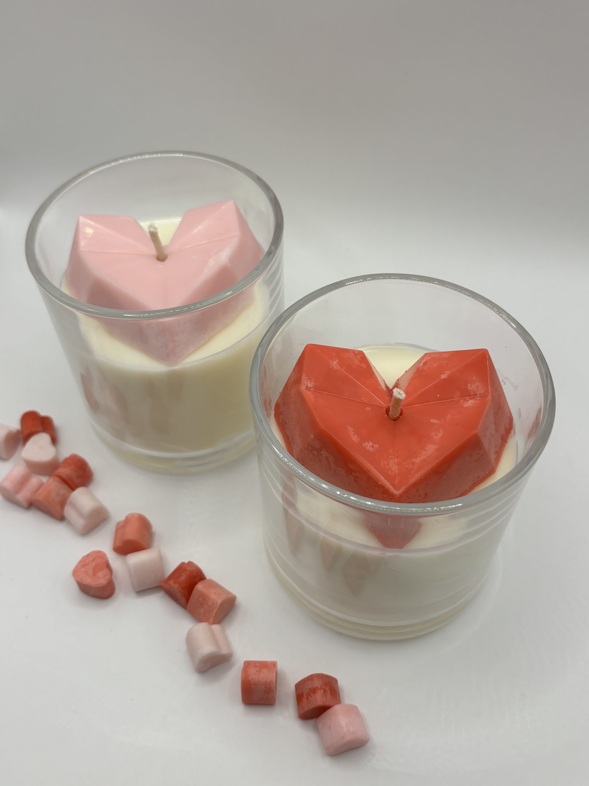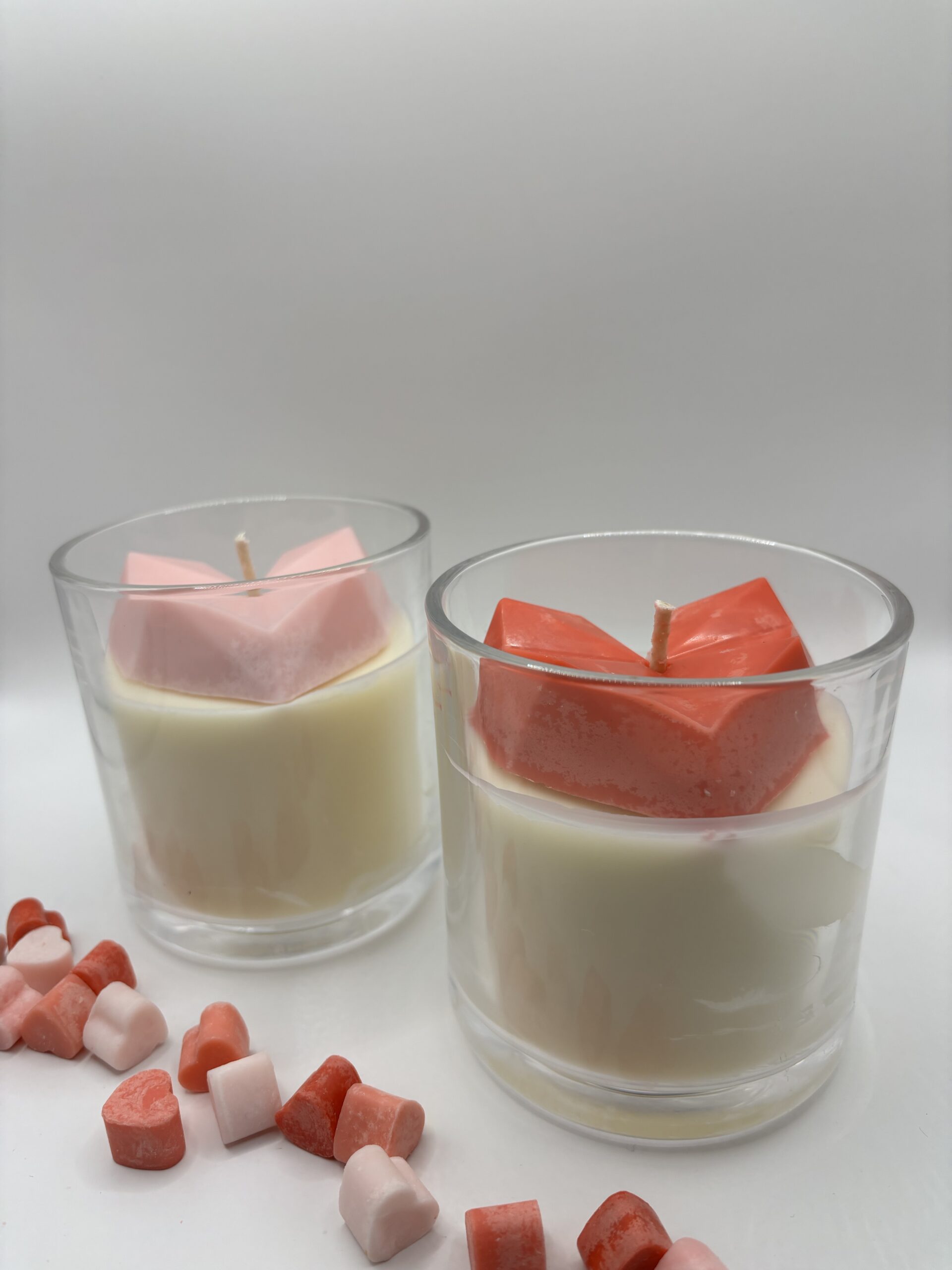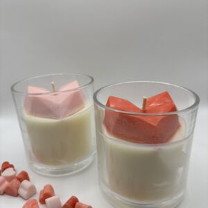 De kaars bestaat uit een laag witte sojawas met musk flower geurolie en afgewerkt met een roze of rood hart.