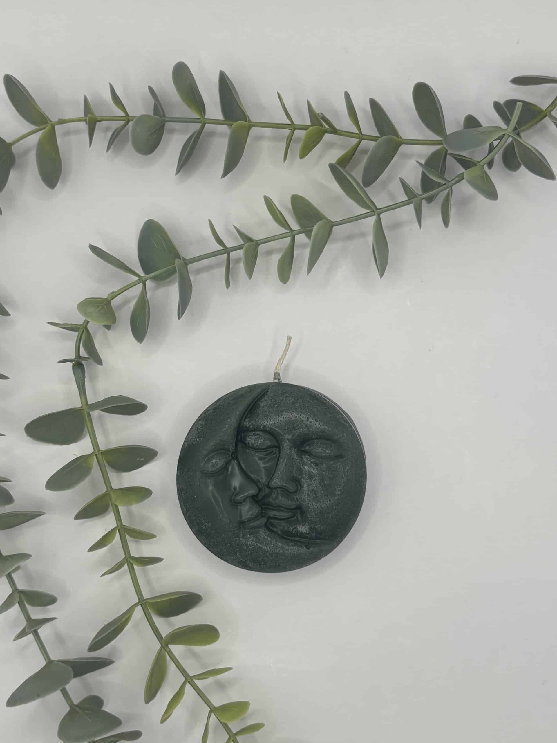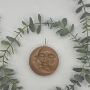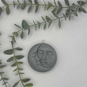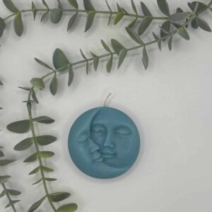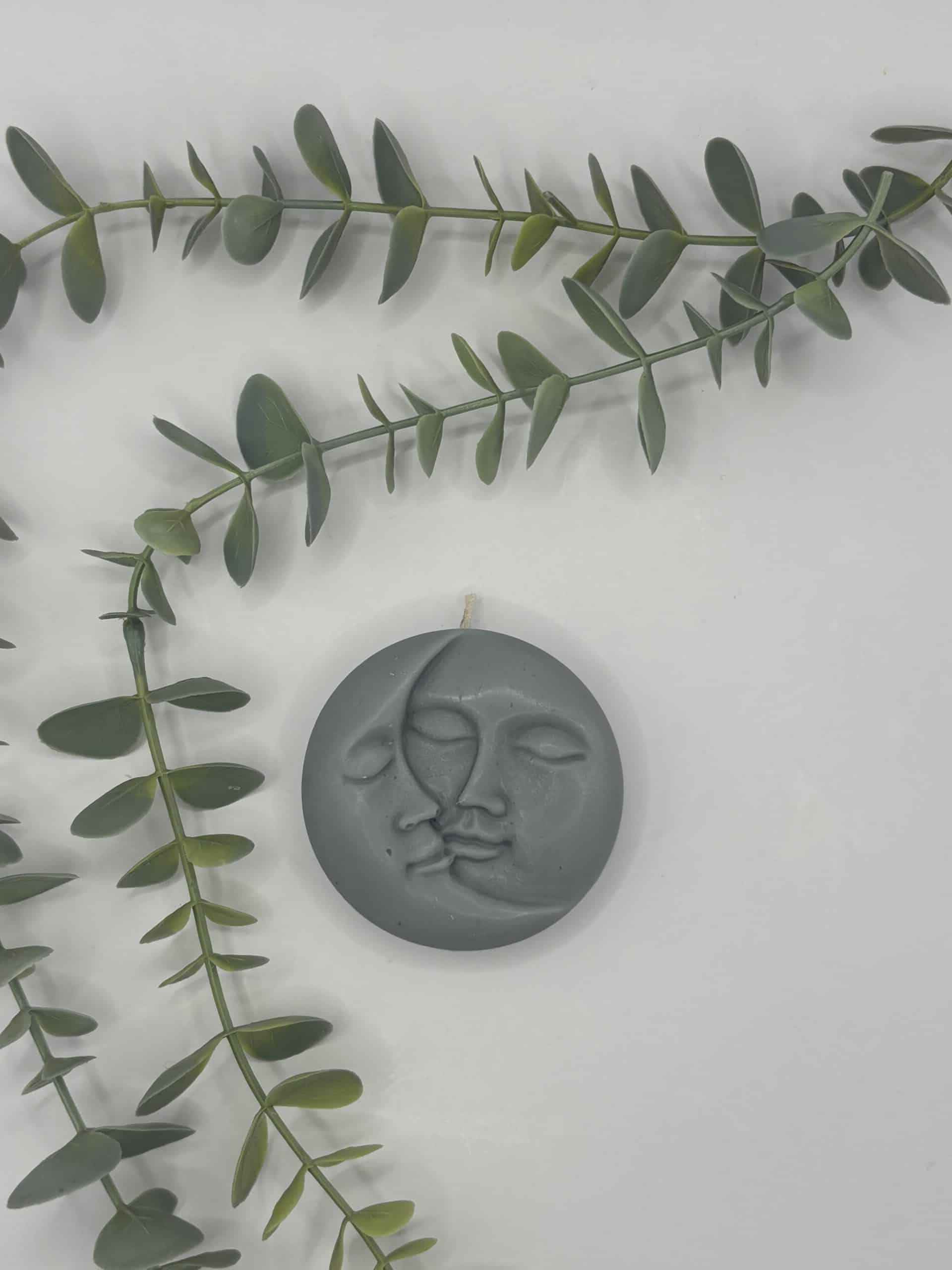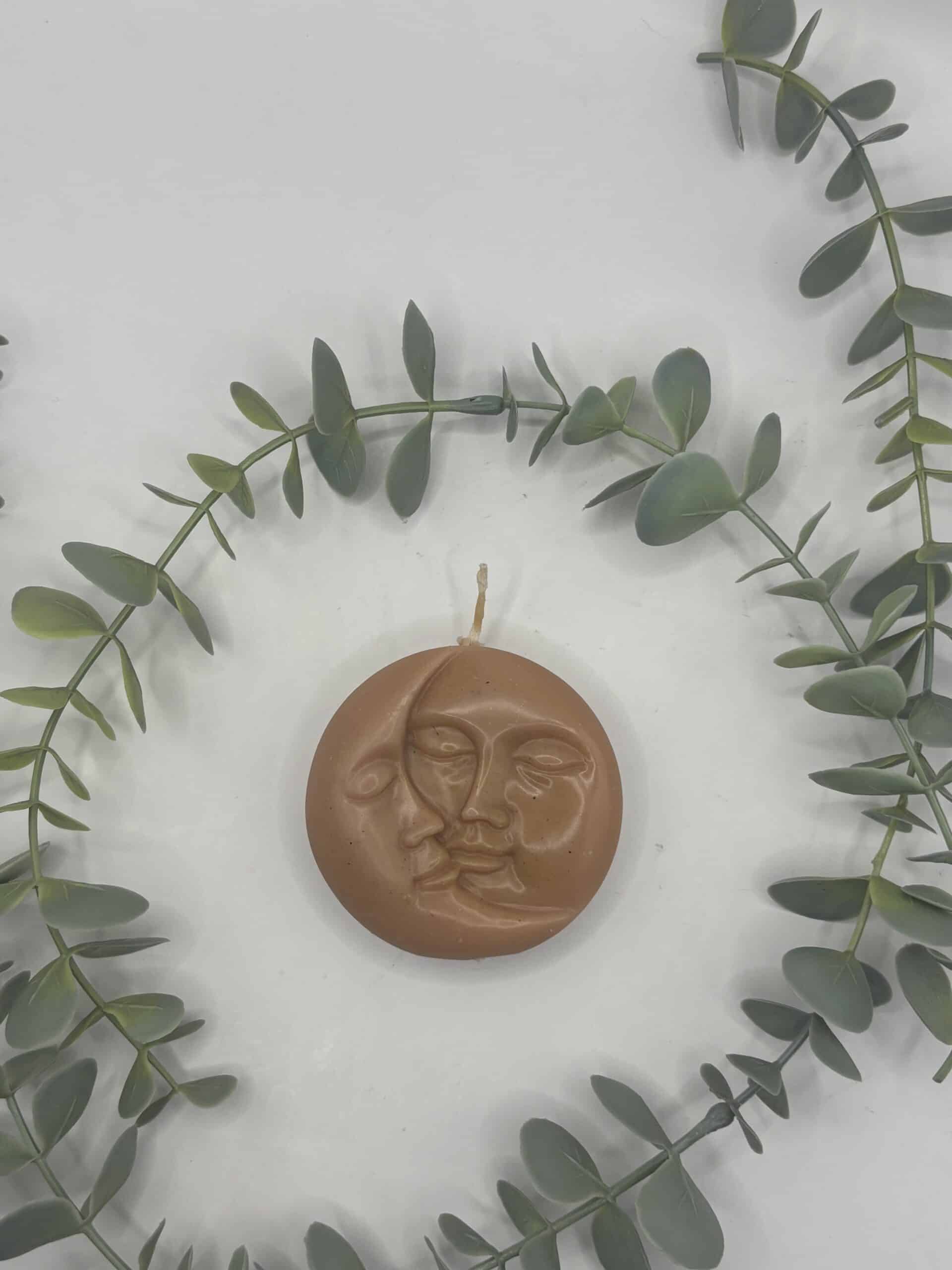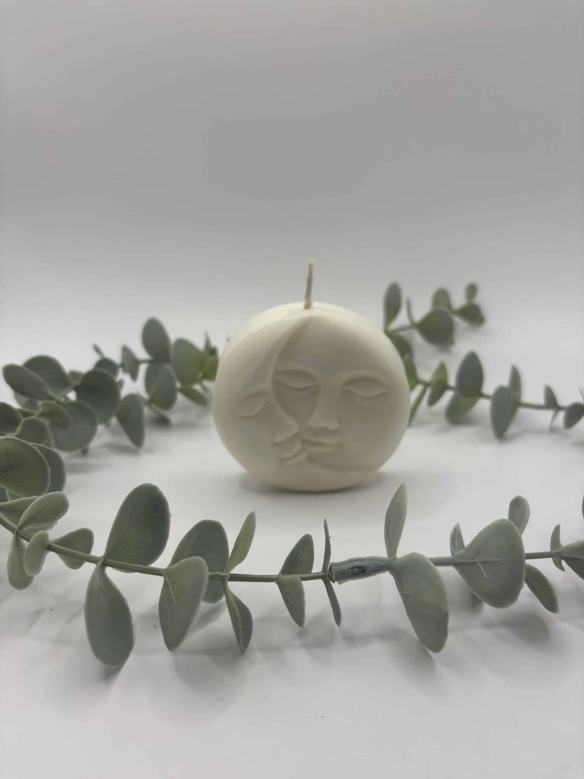 Een witte kaars in de vorm van een maan met twee gezichten.