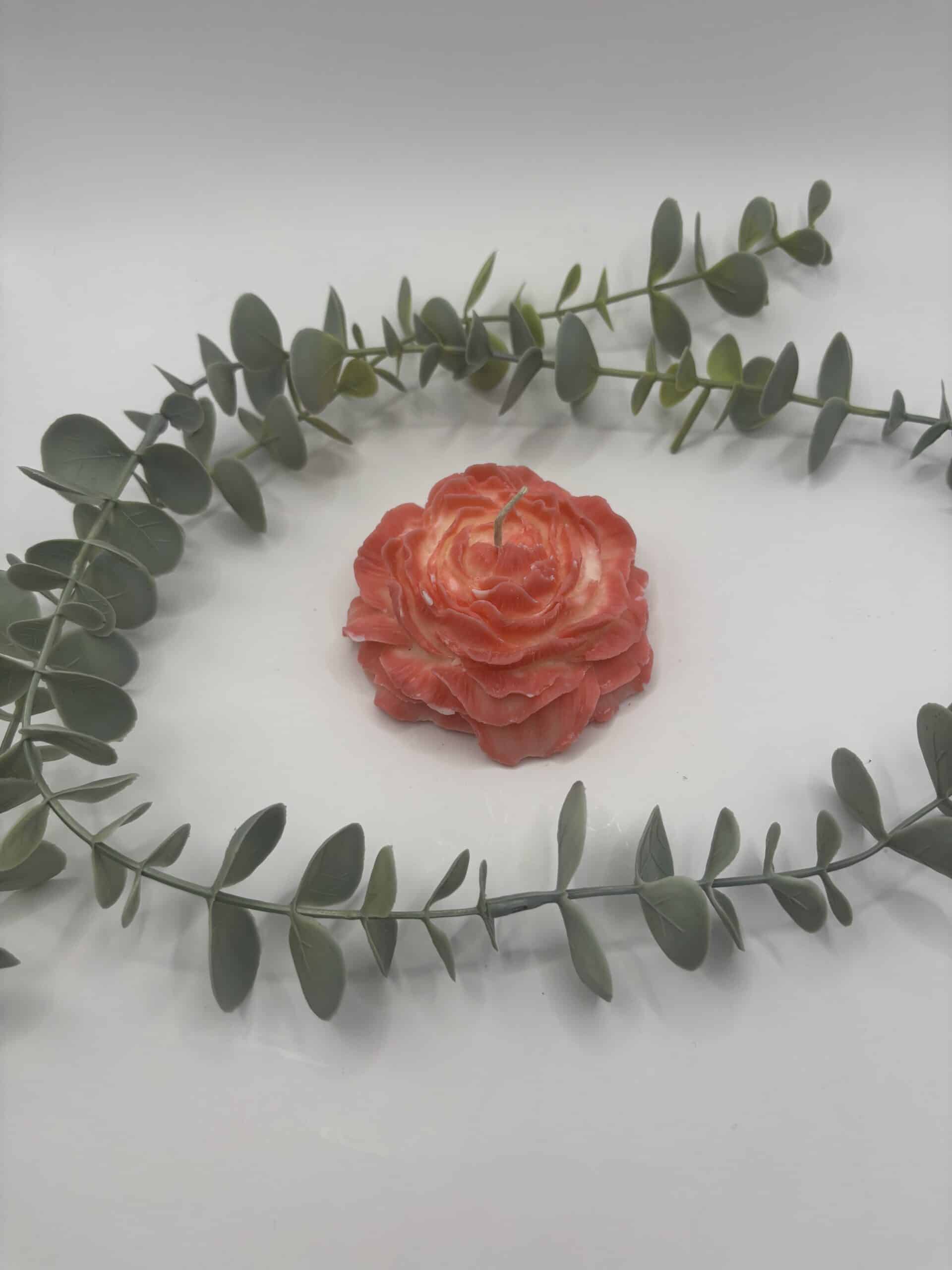 Een kaars met rood en wit in de vorm van een pioen.
