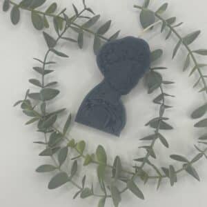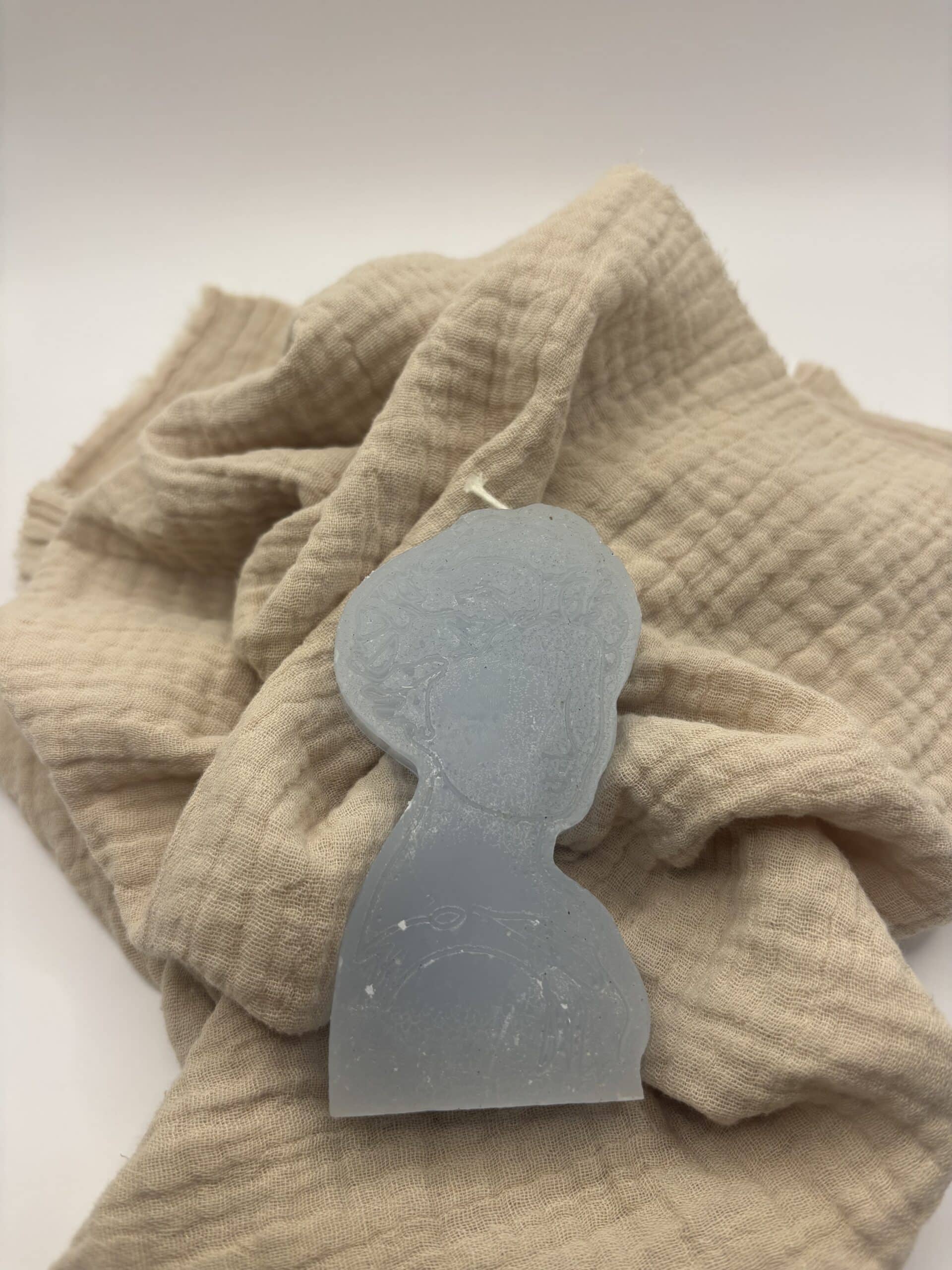 Een licht blauwe kaars in de vorm van een portret van een dame.