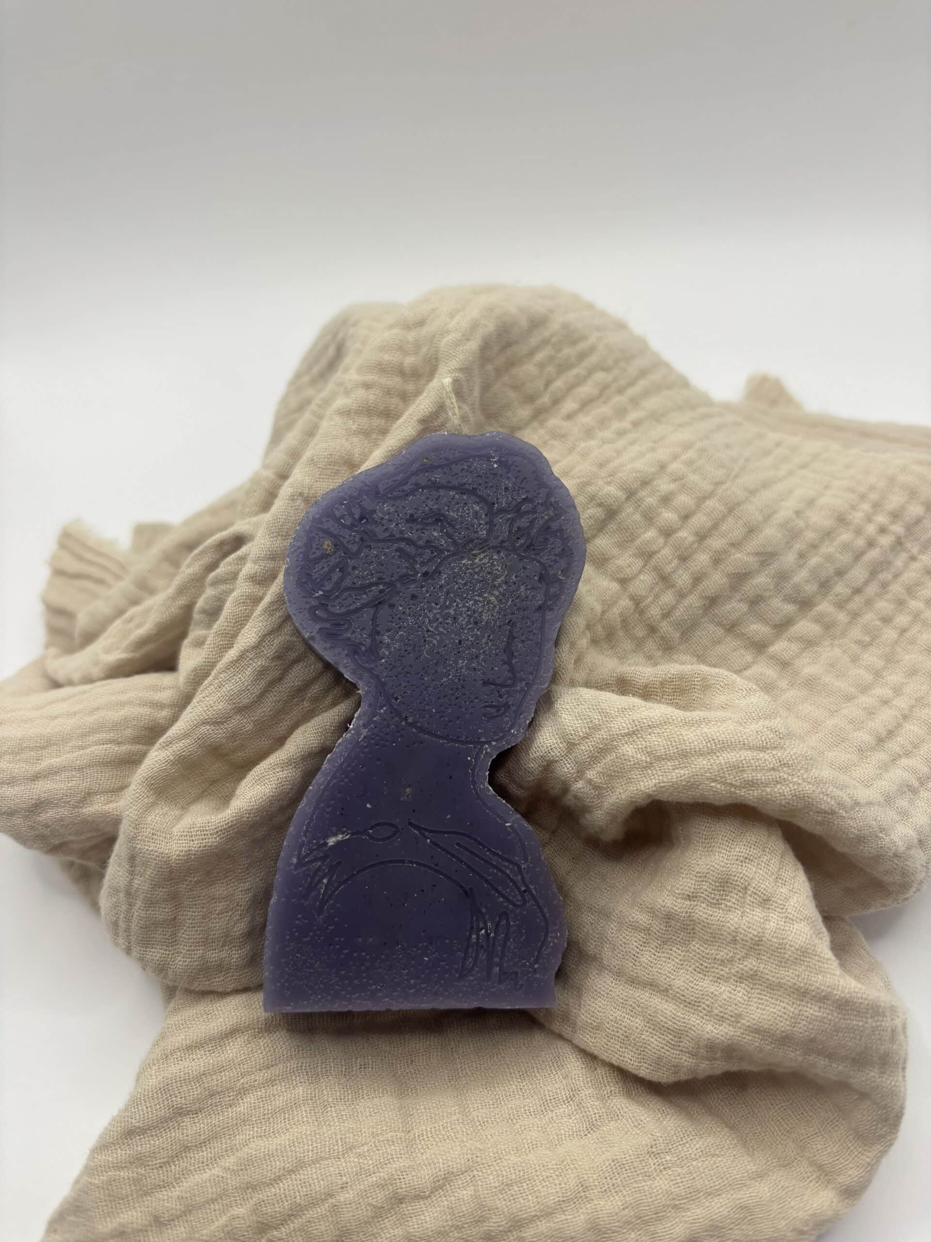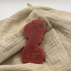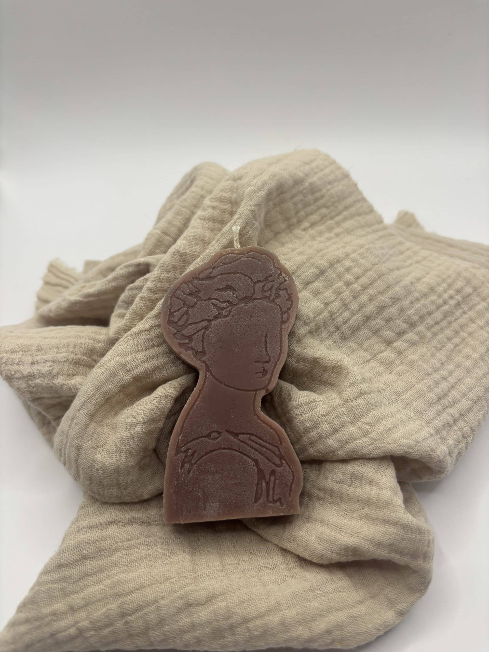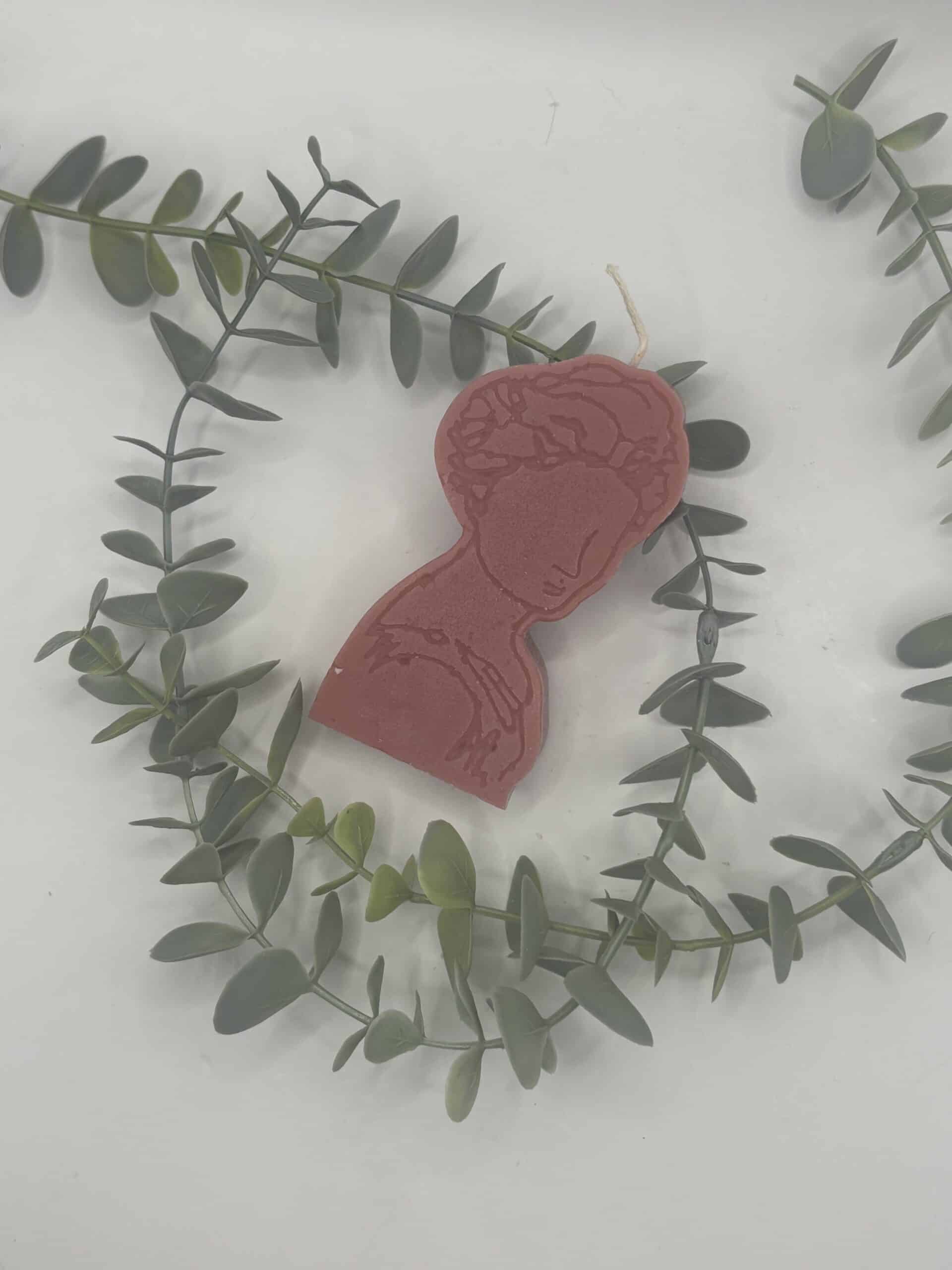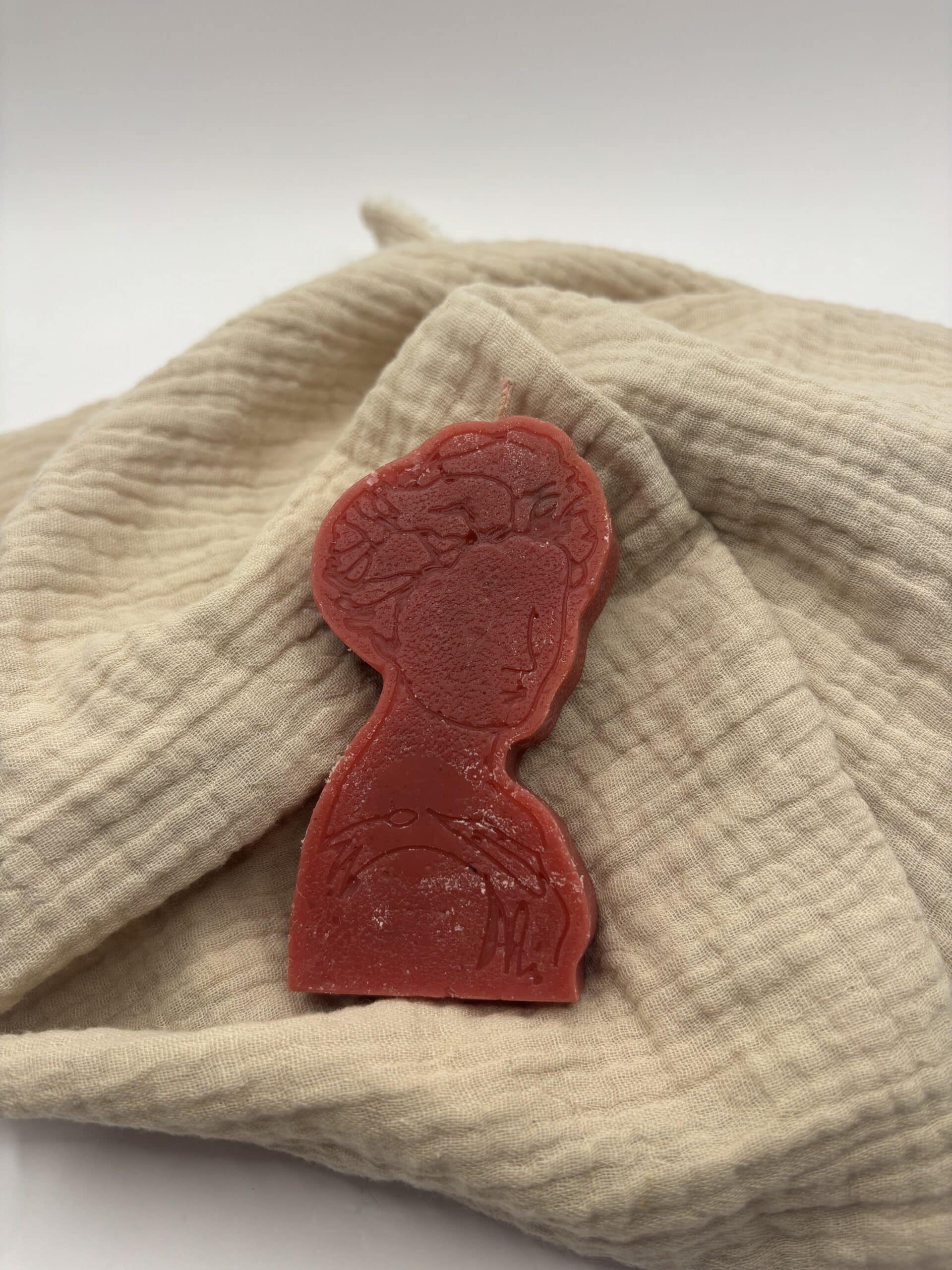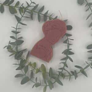 Een bordeaux kaars in de vorm van een portret van een dame.