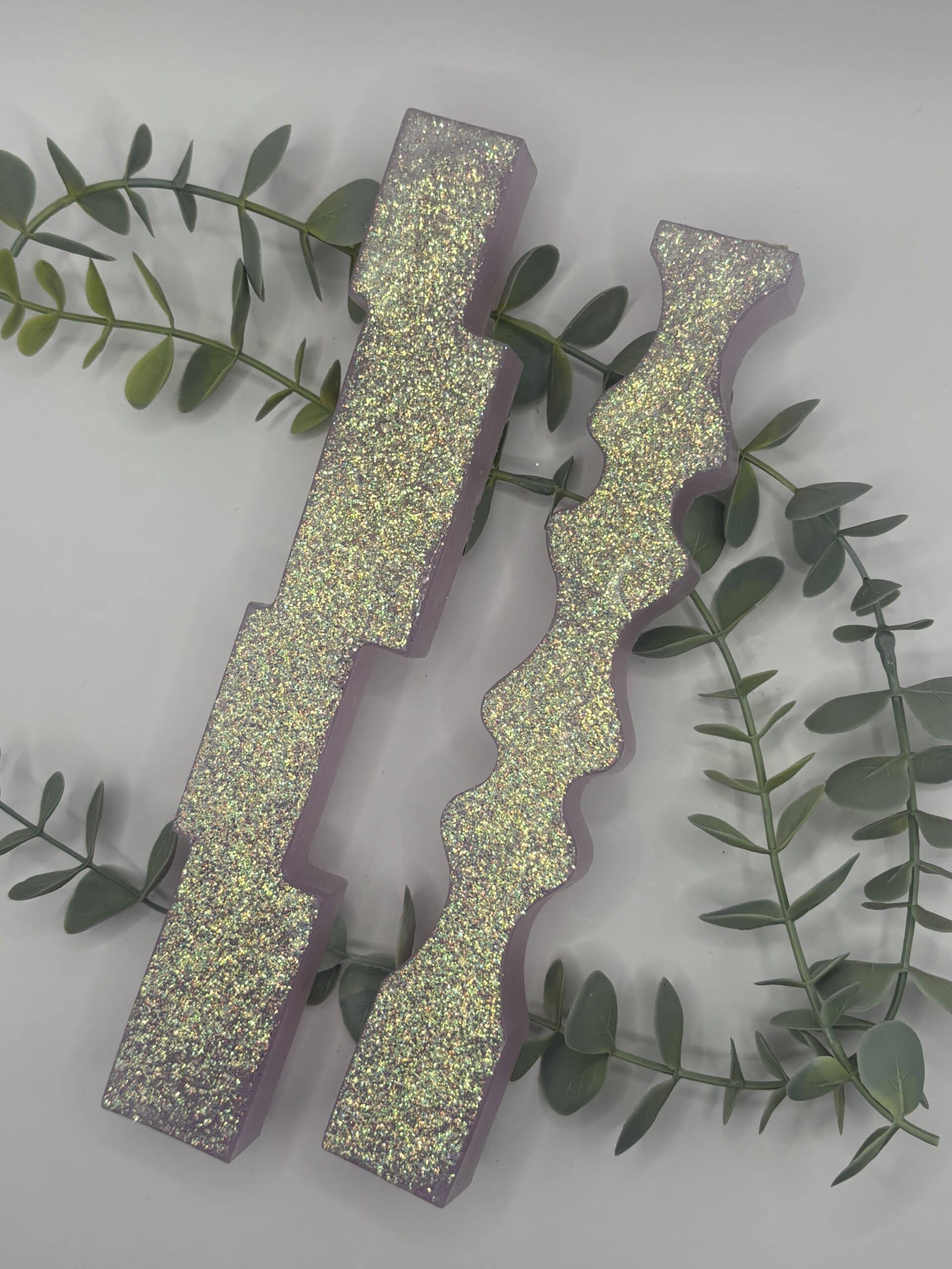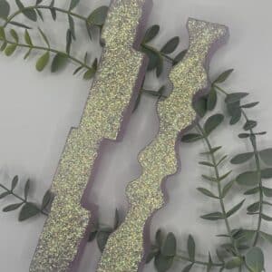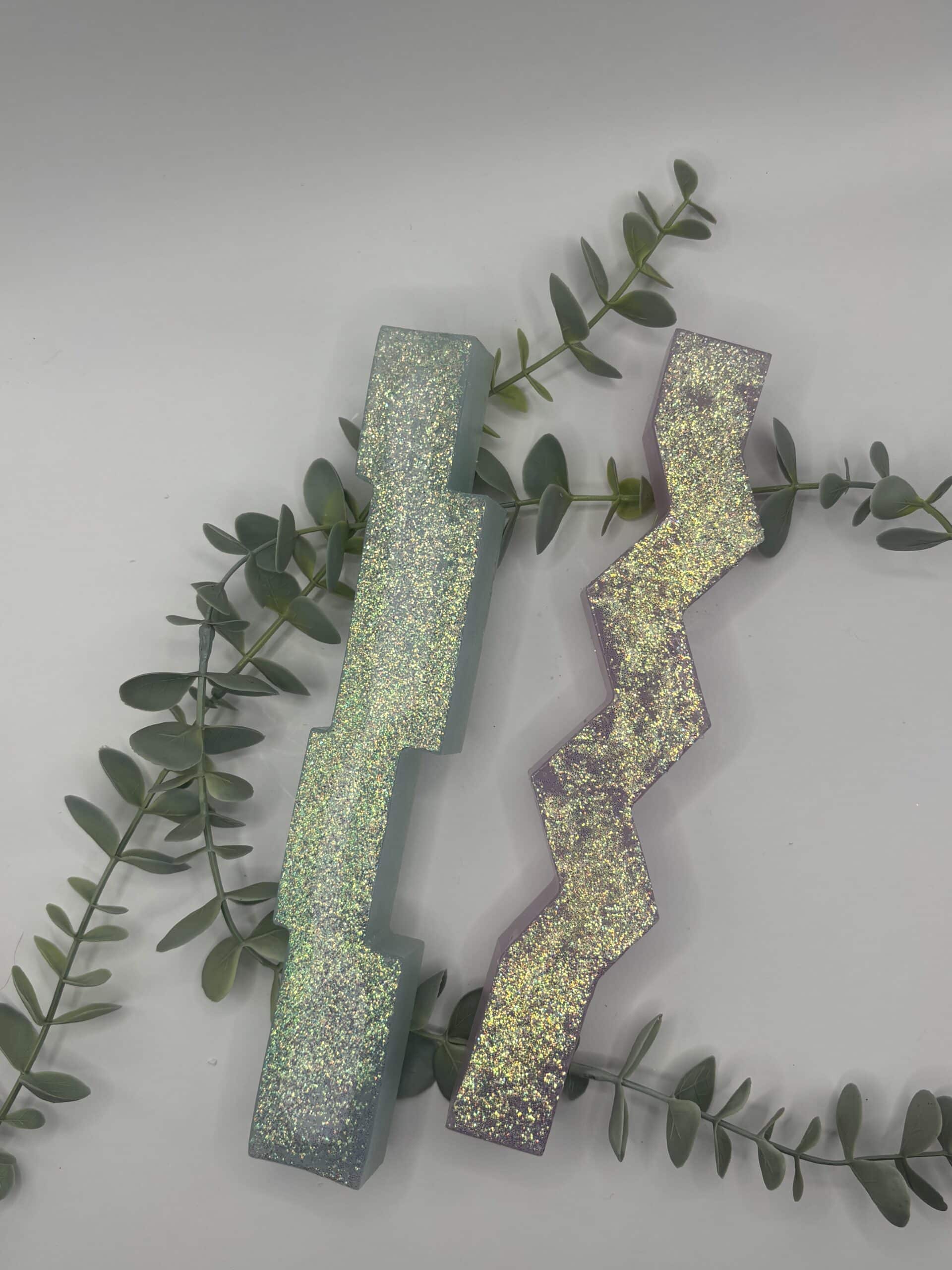 Een set van 2 kaarsen in de vorm van een pilaar. Een licht groene kaars in de vorm van een pilaar bestaande uit 4 blokken op elkaar en een een roze kaars in de vorm van een pilaar met zigzag-patroon. Beiden met holografische glitters.