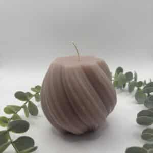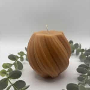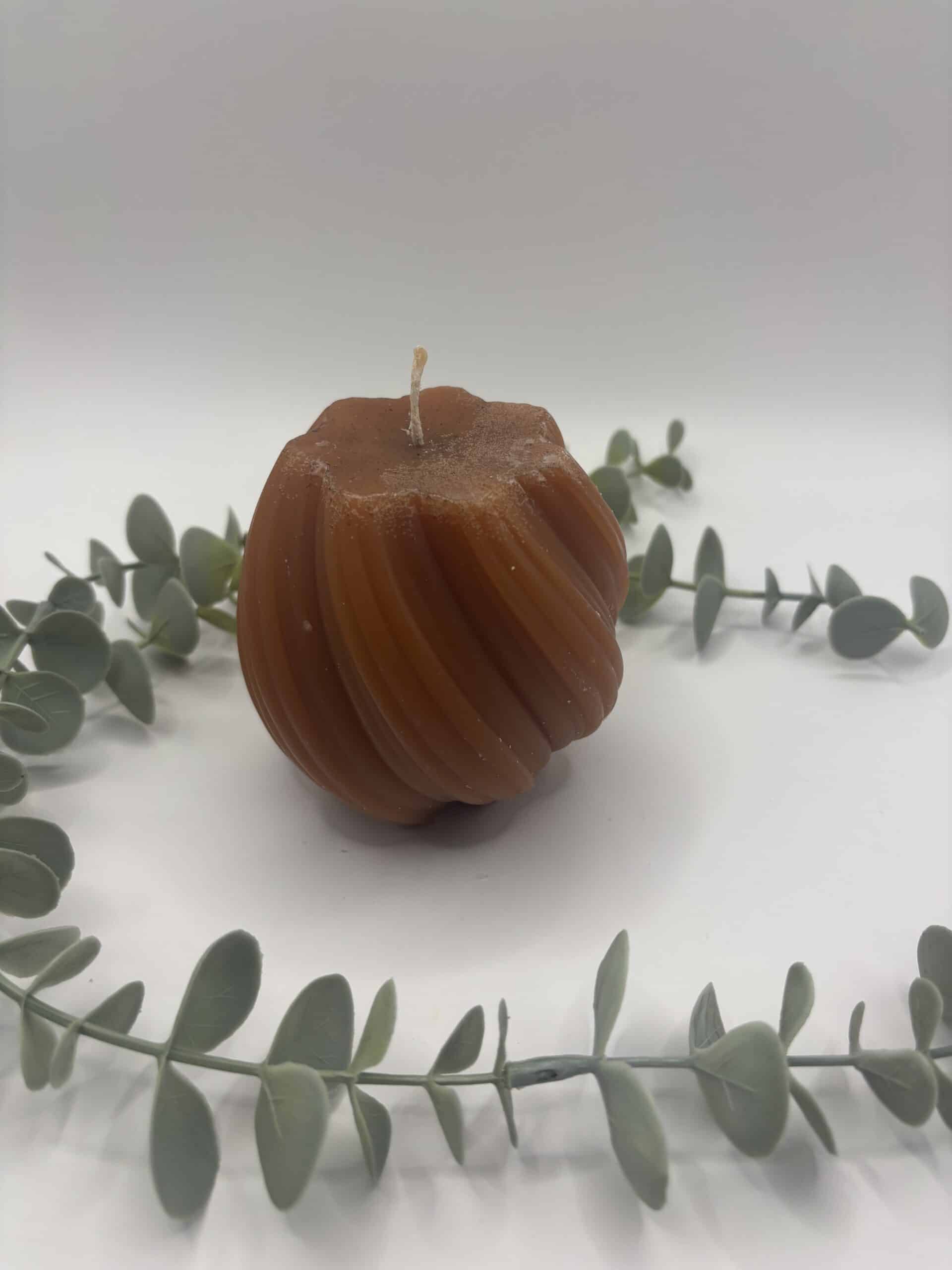 Een donker oker kleurige kaars in de vorm van een bol met groeven.