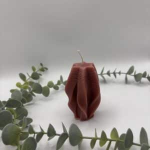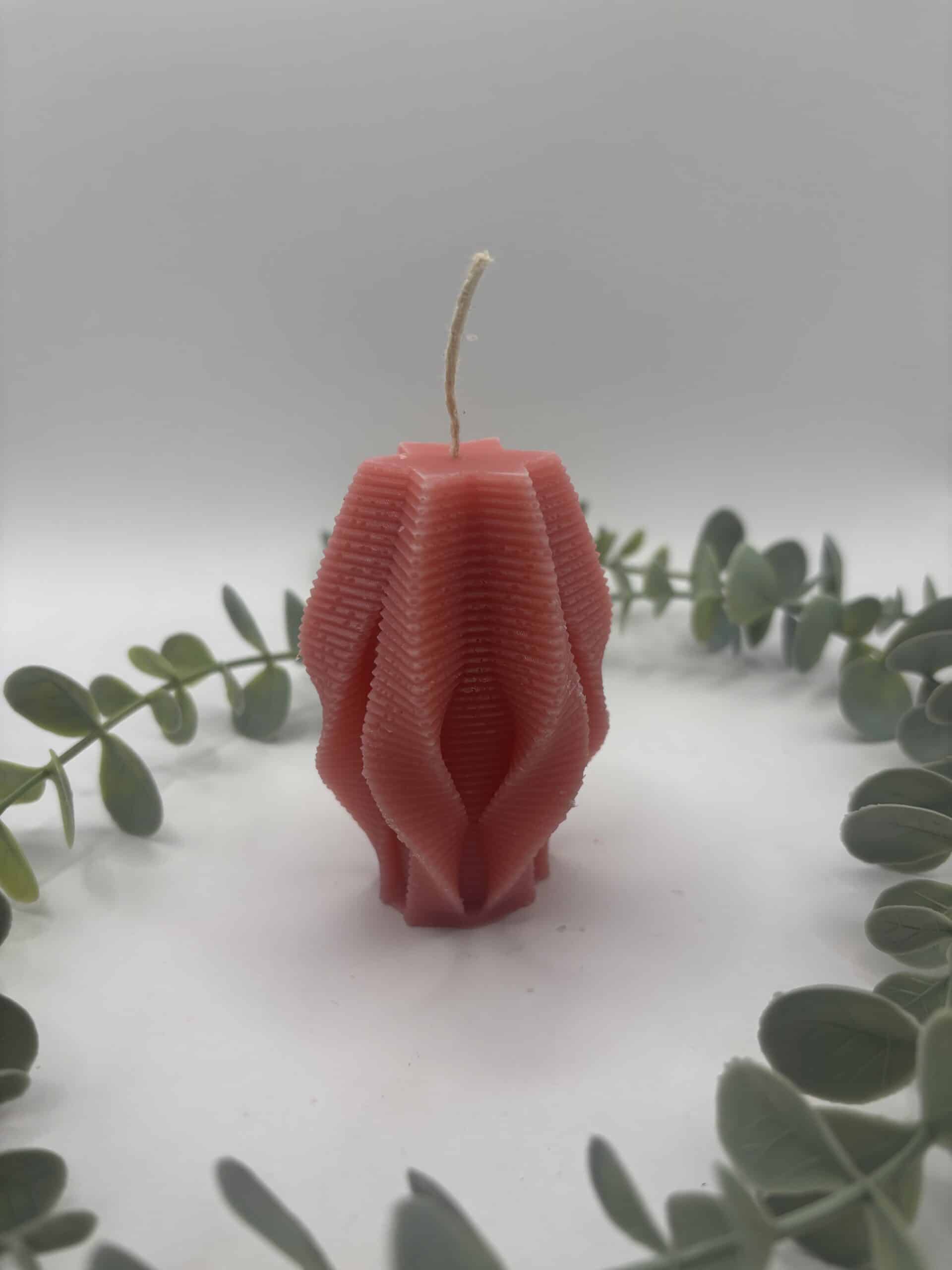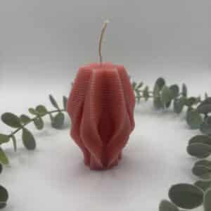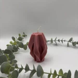 • Een blush kaars in de vorm van een grote cilinder met groeven.