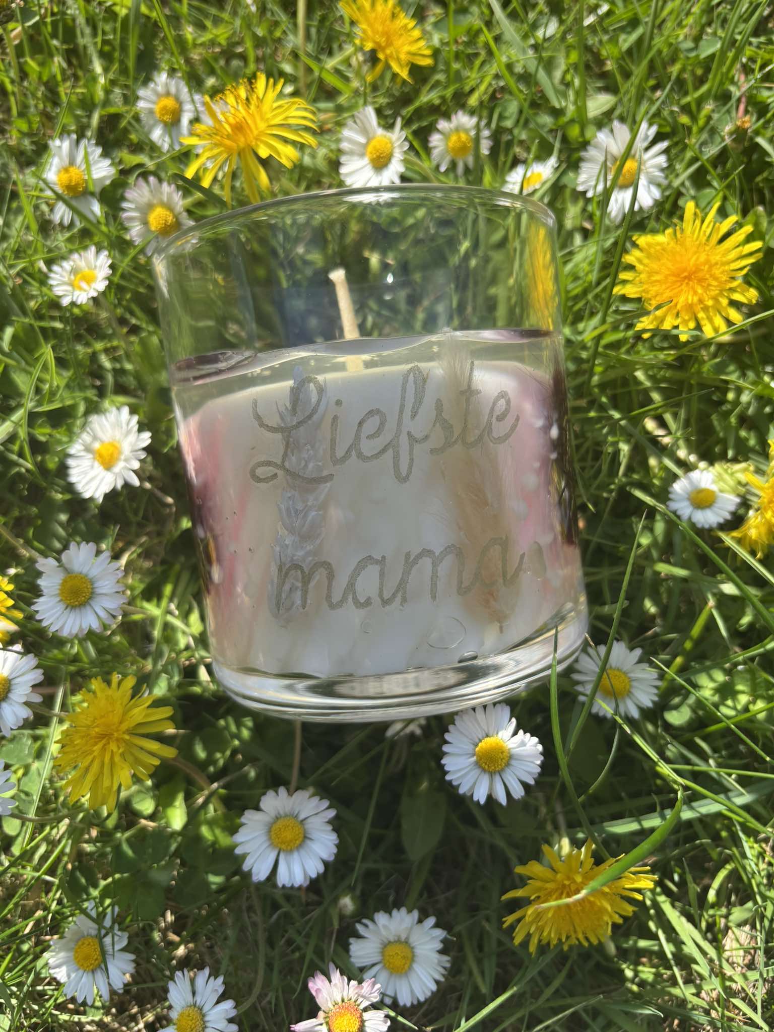 In het glas is ‘Liefste mama’ met de hand gegraveerd.